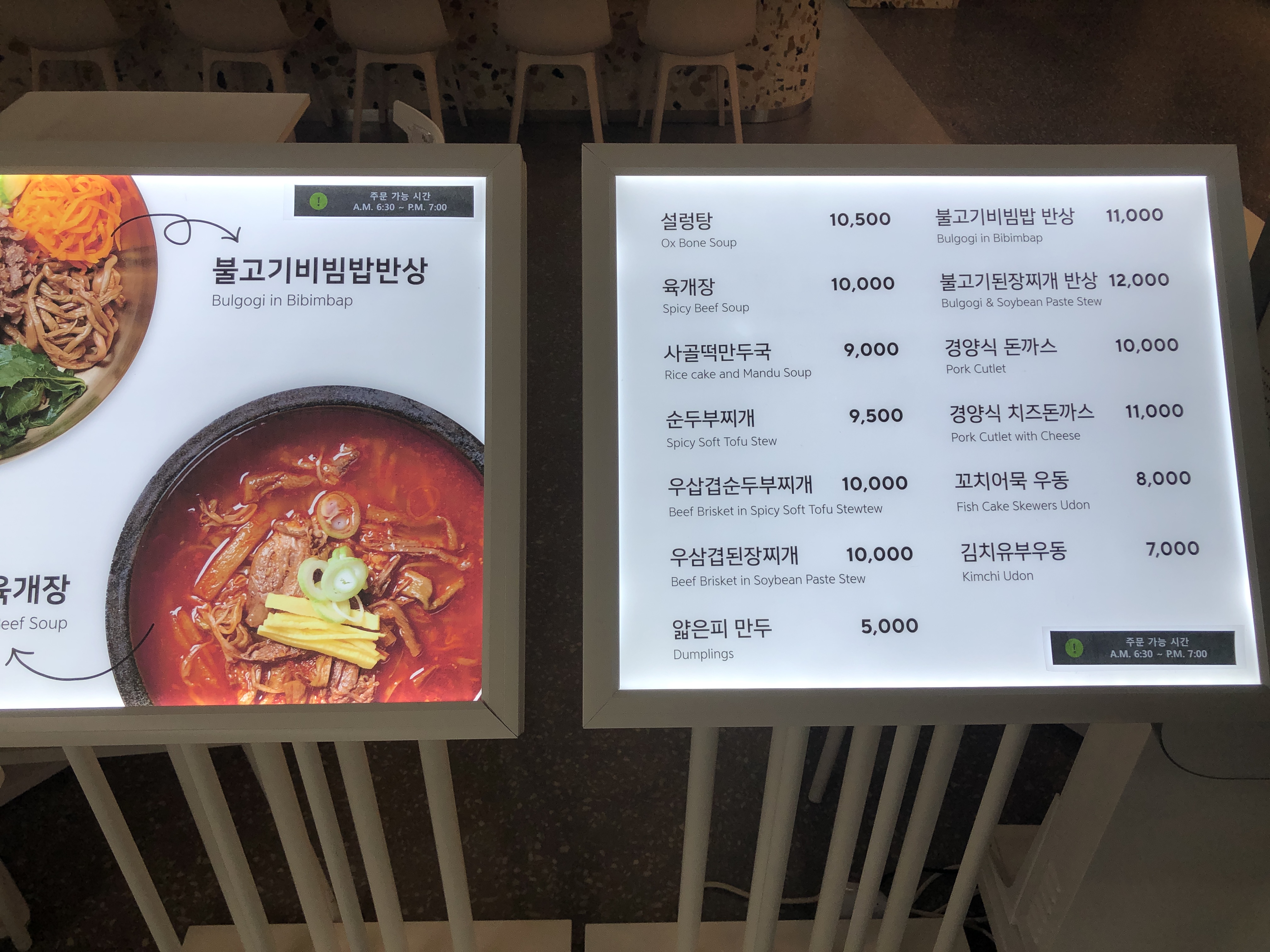 청주공항 푸드코트는 비빔밥, 육개장, 만두국, 된짱찌개, 돈까스, 우동을 팔고 있고 가격은 5천원-만원 정도 합니다.