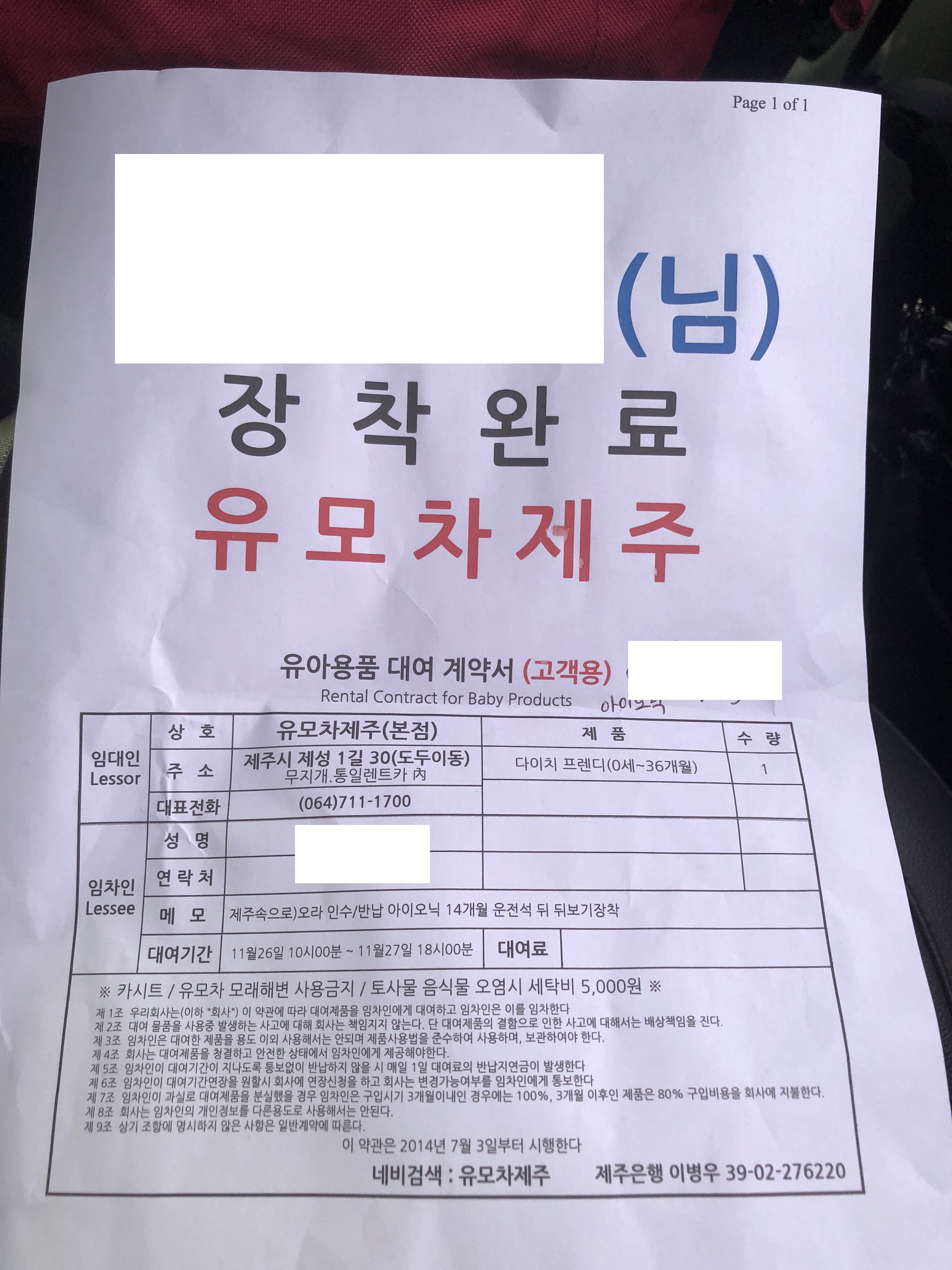 자동차 렌트하는 곳 근처에는 유모차, 카시트, 장난감 등 아기용품대여점이 많았어요. 카시트 대여는 2일 동안 8천원이었고 렌트할 때 이미 설치되어 있습니다. (설치방향은 미리 말씀해주셔야 해요. 저희는 후방으로 설치했어요)