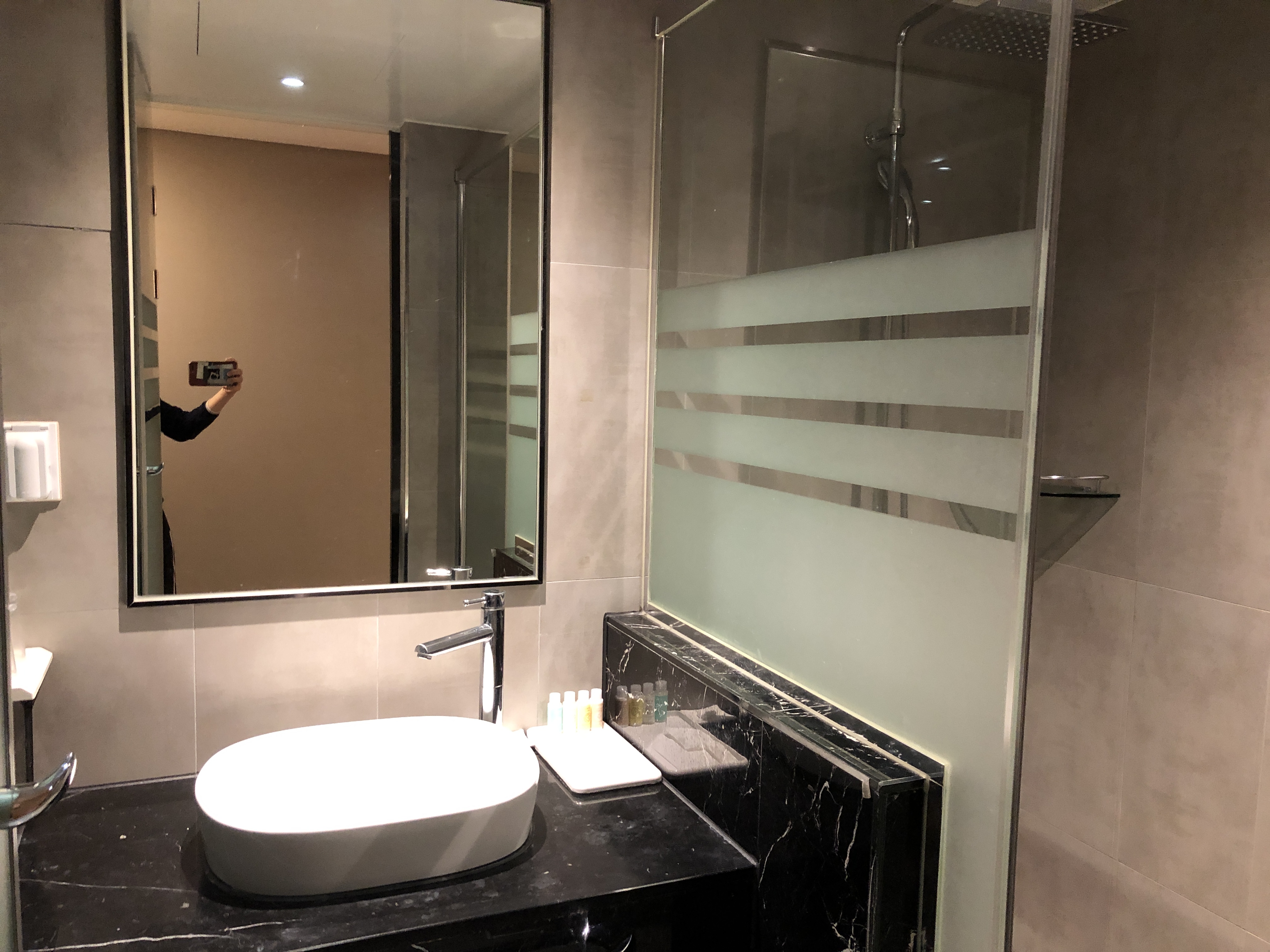 호텔더원은 4성급 호텔이라 인테리어는 멋지지만 수건걸이가 애매해서 좀 불편했습니다. (치약, 칫솔, 면도기 없음) 바닥은 미끄럽지 않았지만 욕조가 없어서 아기를 서서 씼겼어요.
