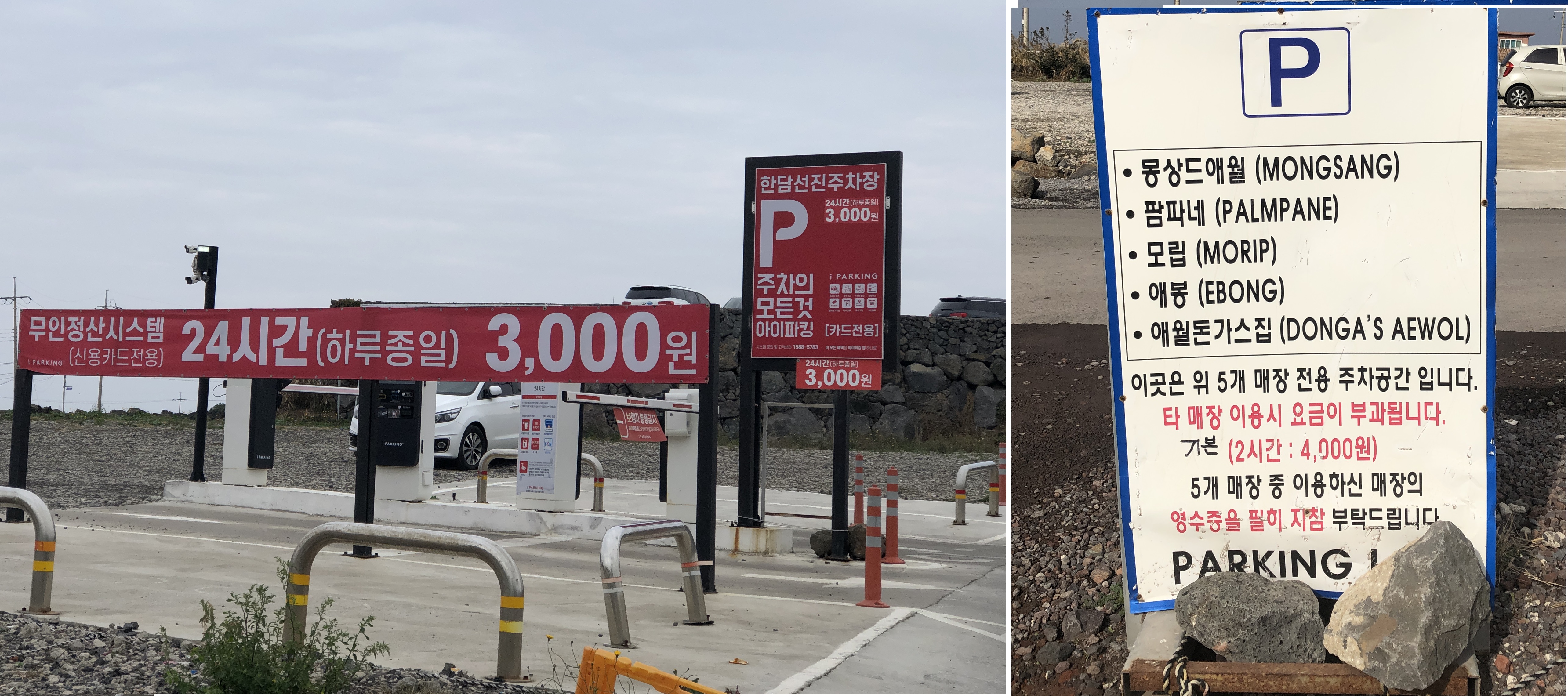 애월카페거리 주차는 영수증이 있으면 무료입니다. (몽상드애월, 팜파네, 모립, 애봉, 애월돈까스집 전용주차장)