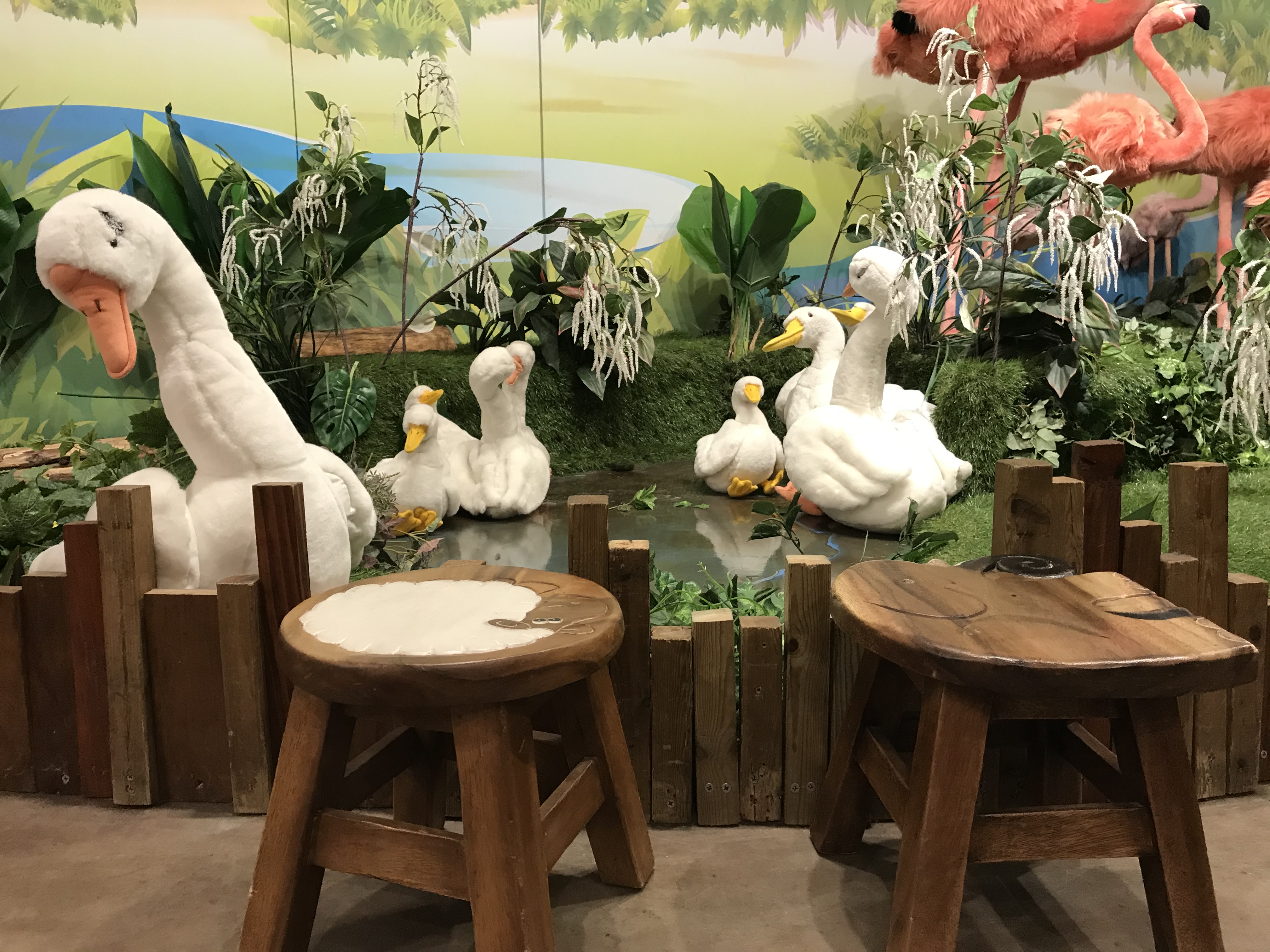 상자에 들어가서 판다랑 사진을 찍거나 이렇게 앉아서 백조들과 사진을 찍을 수도 있어요.