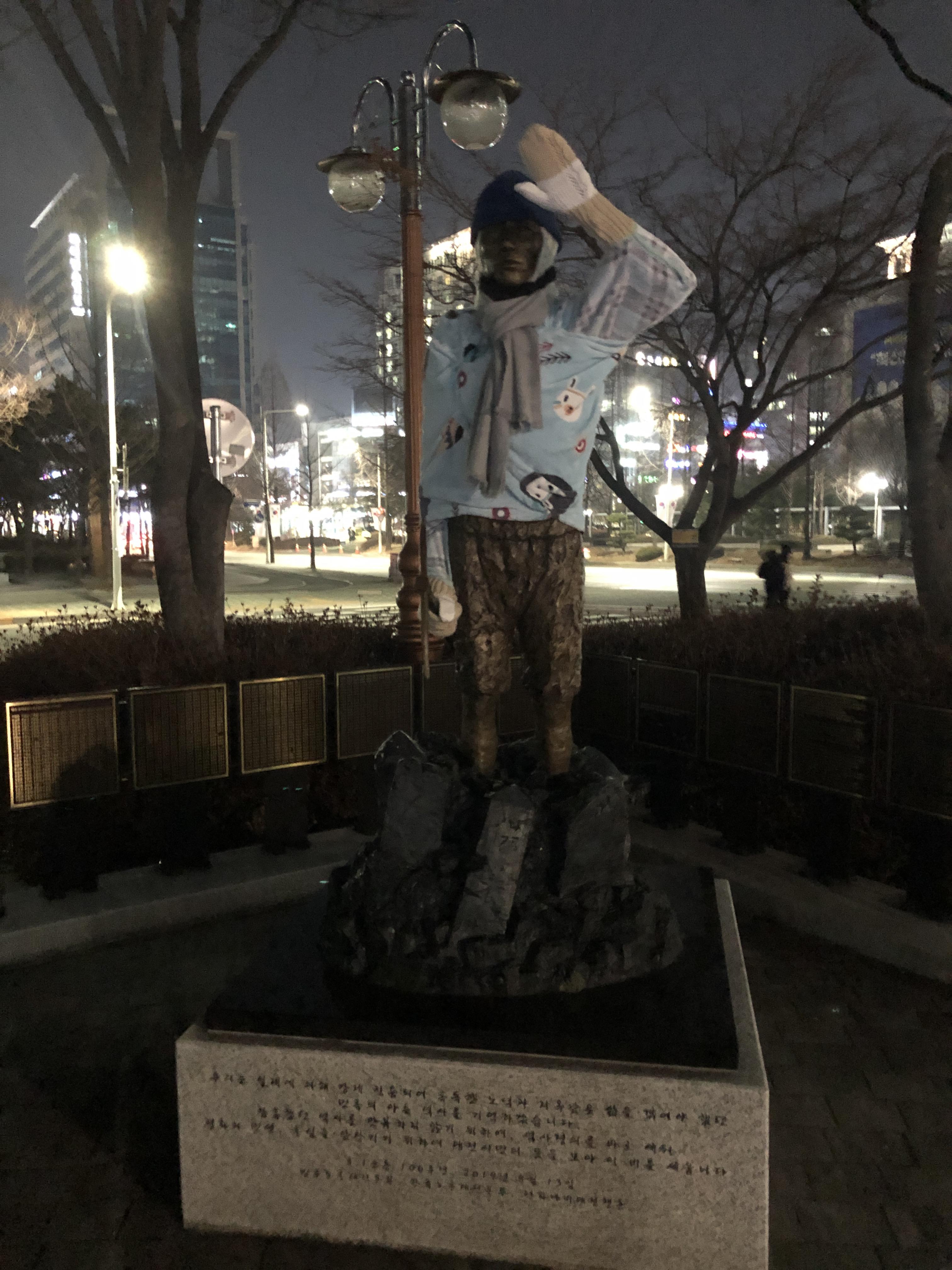 진짜 사람인 줄 알고 깜짝 놀랐습니다. 입구에는 양 옆에 동상이 있어요. 전쟁과 식민지로 뼈아픈 우리 역사를 잊지 말자는 동상이에요. (소녀상 사진은 왼쪽에 있는데 깜빡해서 찍지 못했네요)