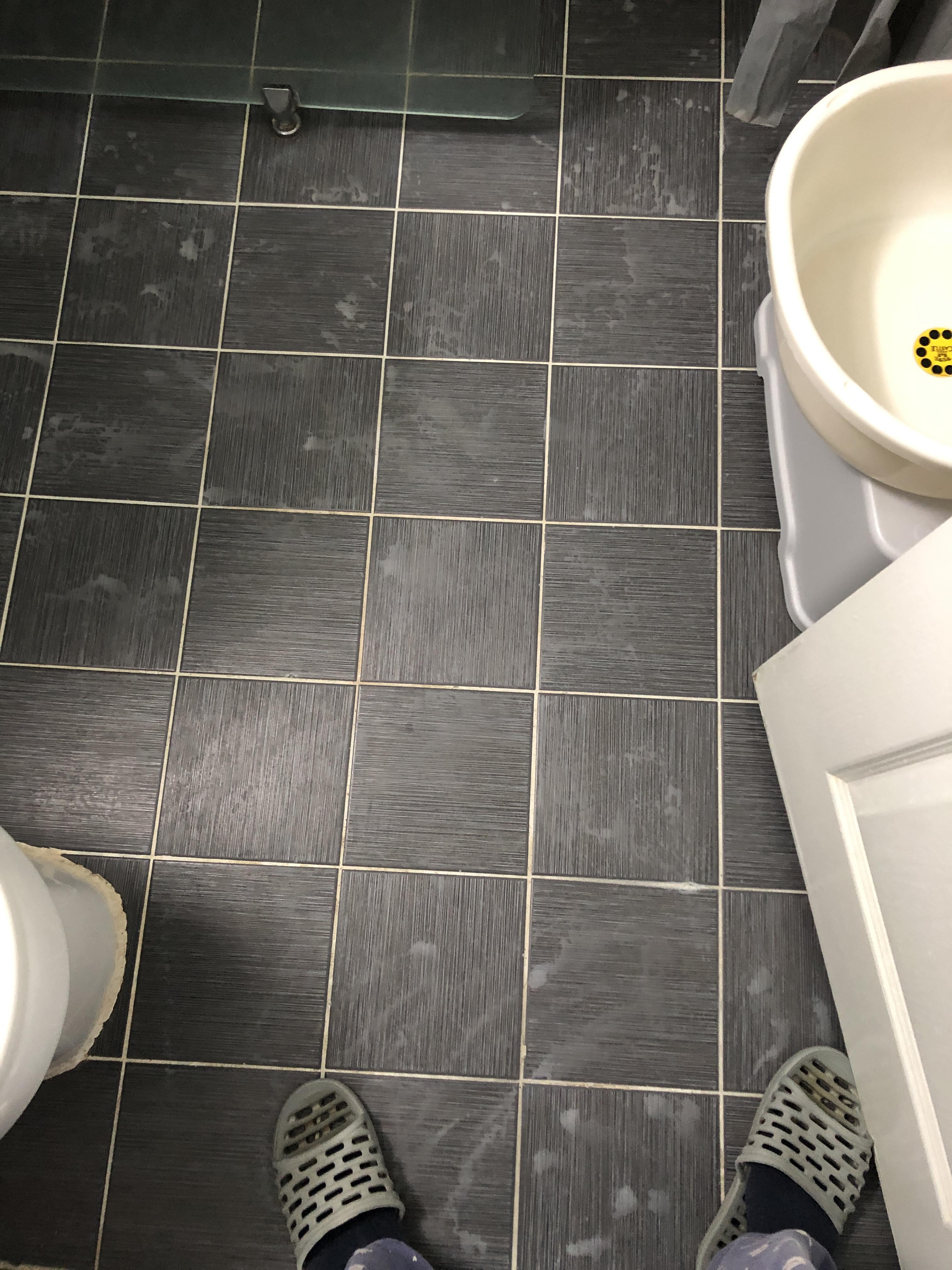 물론 물이 닿으면 저 하얀 얼룩들은 사라져요. 그런데 물이 마르면 다시 저렇게 하얗게 됩니다. 하얀 부분은 정말정말 안미끄러워요. 남편이 아기 목욕시키는데, 확실히 논슬립에스를 뿌리니까 미끄러움은 안느껴진다는데 얼룩이 문제네요.