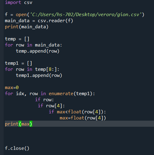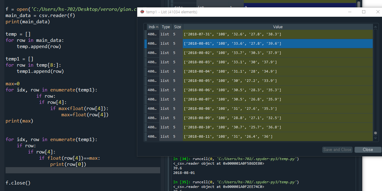 max라는 방을 만들고, enumerate함수와 if 함수를 써서 빈 리스트값이 아닌 경우 if row[4] 스트링타입의 인덱스를 호출한다. 만약 if row[4]를 가지고 max를 구한 뒤 print(max)를 하면 39.6 라는 값이 도출된다.