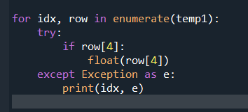 이 경우 if row를 추가해서 리스트가 비어있지 않은 경우(참인경우) 스트링형태인 if row[4]가 참인경우 float(row[4])를 실행시킨다.