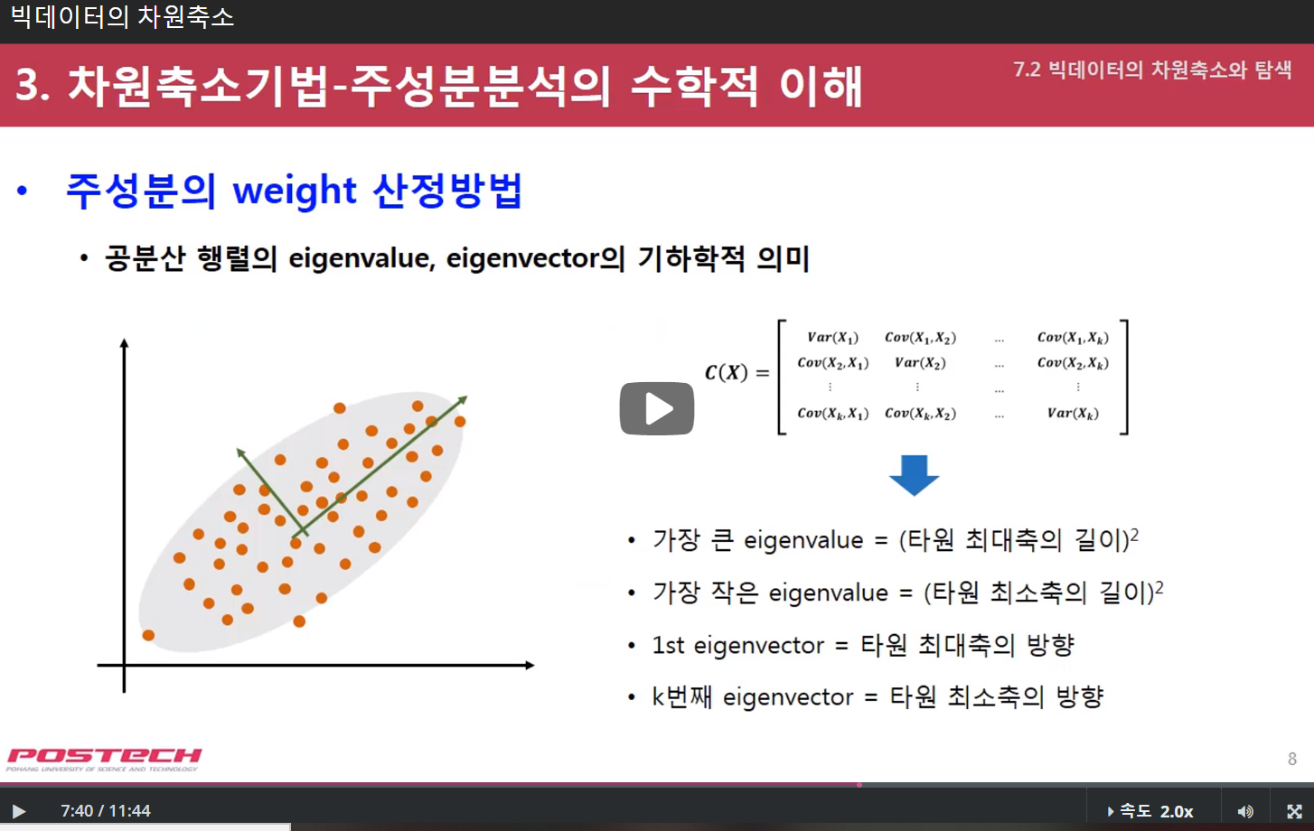 - 주성분의 weight 산정방법: 공분산행렬(서로다른 확률변수의 상관관계를 나타내는 행렬, 변수가 k개일 때 공분산행렬(KtX)