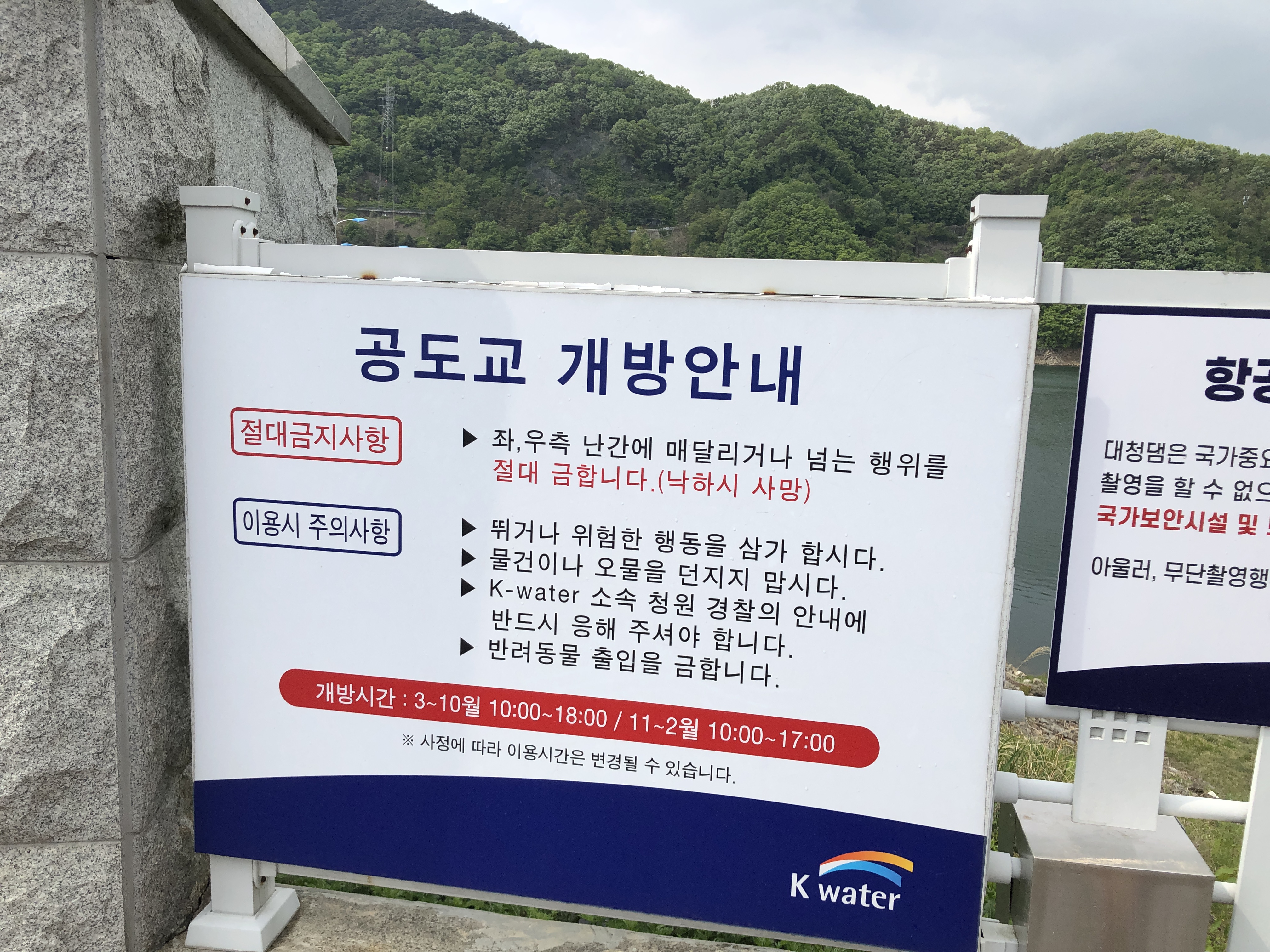 다시 주차장으로 내려가기 전에 대청호 댐의 공도교를 걸어보았습니다. 10시부터 18시까지 개방합니다. (동절기 17시까지 개방) 공도교에서는 보안상 드론을 날리시면 안됩니다! 사진이나 눈으로 풍경을 담아가시길 바랍니다.