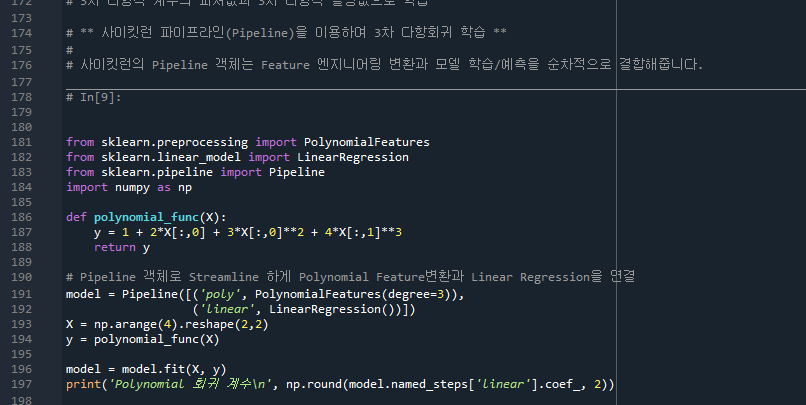 즉, Pipleline에는 PolynomialFeatures와 LinearRegression이라는 두 개의 절차가 들어가 있다.