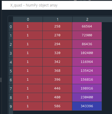 1차식을 2차식으로 표현하기 위한 데이터로 바꾼 결과 X_quad는 다음과 같다.