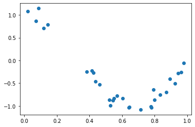 - 275줄: np.random.randn( ) 는 0~1까지의 가우시안표준정규분포값 사이에서 n_samples 수 만큼 실수난수를 생성. 이로서 평균이 0인 곳에서 노이즈를 섞어준다. 즉, y값은 0~3/2pi까지의 값에 노이즈를 섞어준 값. (cos그래프는 1~-1값 사이인데, 노이즈가 섞여서 1.08처럼 1을 넘을 수 있다. 즉 1에서 -1까지 갔다가 0으로 돌아온다.)