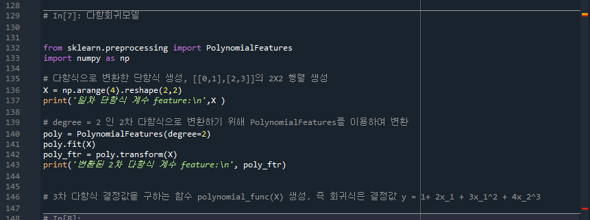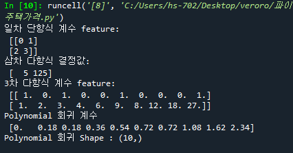 - 파이썬 (컴퓨터) 입장에서는 다항계수로 만든다는 것은 feature의 개수를 늘리는 것으로 본다. (따라서 이를 선형함수로 본다)