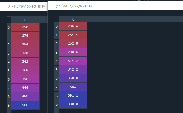 - X는 (10, 1), y는 (10,) 각각 dimension이 2차원, 1차원이다.