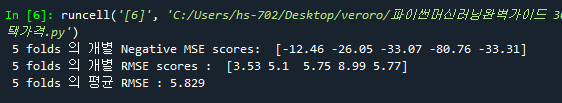 - 112줄: scoring="neg_mean_squared_error" 값이 낮을수록 우수한 모델임 (교차검증 지표 평가기준) 이를 반환하면 음수값이므로 앞에 -1을 곱한다.