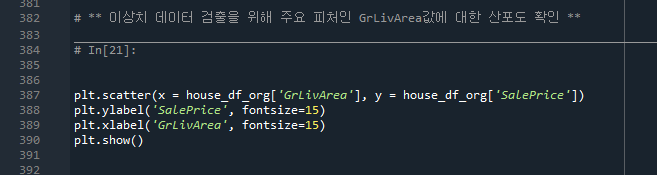 - 387줄: 로그변환하여 데이터전처리한 값들의 scatter 값을 본다.