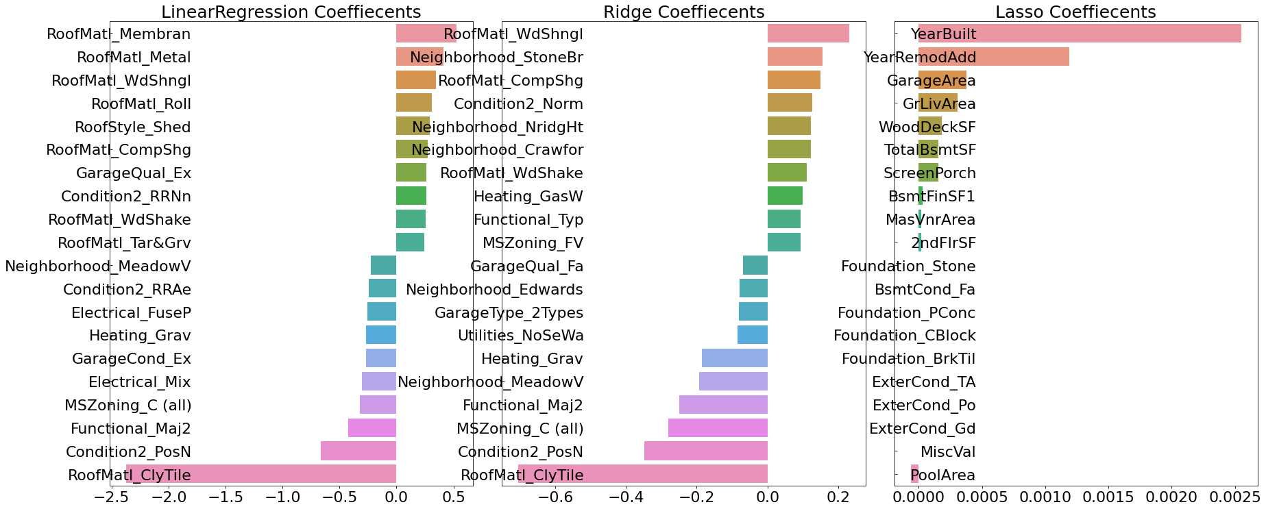 - Ridge와 Lasso 회귀계수보다 LinearRegression의 회귀계수가 더 크다.