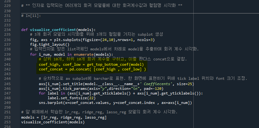 - 219줄: 회귀계수를 뽑아서 그 index값으로 column이름을 넣는다. 내림차순으로 정렬 후 상위10개, 하위 10개를 각각 coef_high와 coef_low에 담는다.