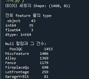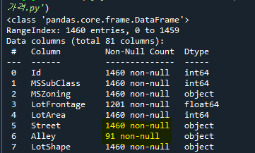 - 100줄: 데이터세트 shape, 전체 feature의 type, null 컬럼과 건수를 알 수 있다.