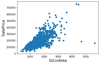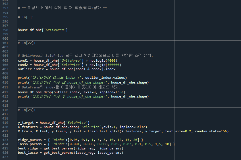- 405줄: GrLivArea가 4000이상이고 SalePrice가 500000보다 작은 outlier인 index를 outlier-index에 넣는다.
