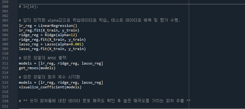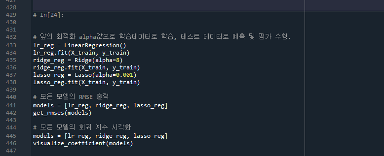 - 432줄: 최적화 된 alpha값으로 학습, 테스트데이터 예측/평가 수행
