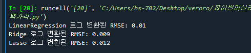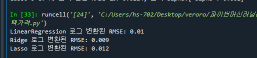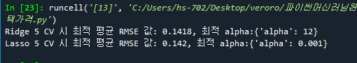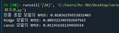 - 365줄: 데이터 전처리 후 Ridge와 Lasso의 RMSE값이 달라짐. (개선됨)