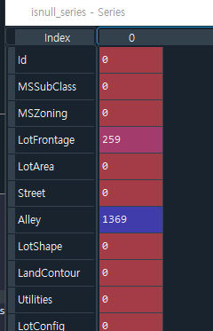 - 102줄: isnull_series에는 house_df가 isnull( )에 해당되는 불린값의 element가 들어오며, 이 element의 개수를 sum한다.