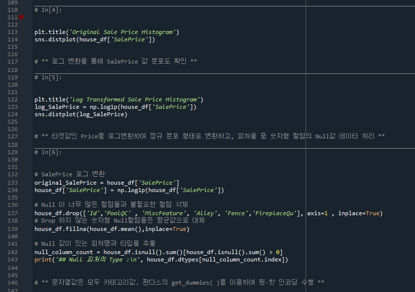 - 114줄, 124줄: 원본 'Sale Price' 그래프와 log화시킨 'Sale Price'그래프 비교
