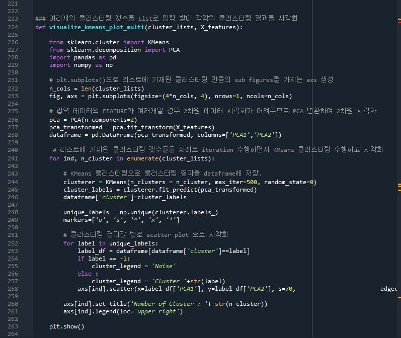 - 224줄: visualize_kmeans_plot_multi로 kmeans군집화를 시각화