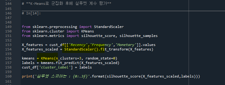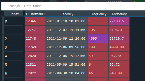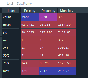 - 141줄: cust_df.describe( )를 test3객체에 넣어보면 Frequency, Monetary의 max값이 지나치게 큼을 알 수 있다. (중위값과 평균값의 차이가 너무 큼)