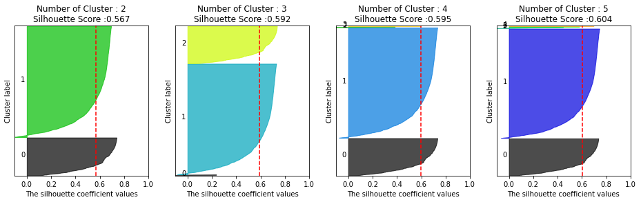 실루엣 계수는 각 군집간의 거리가 얼마나 효율적으로 떨어져 있는지를 나타내는 지표이며, 0에 가까울수록 근처의 군집과 가깝고 1에 가까울수록 근처의 군집과 멀리 떨어져있음을 의미한다.