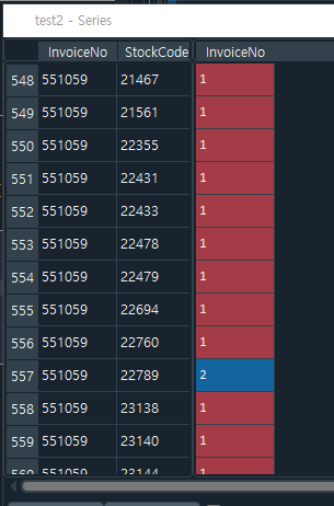 참고) test2=retail_df.groupby(['InvoiceNo','StockCode'])['InvoiceNo'].count( ) 를 객체에 담아보았다.