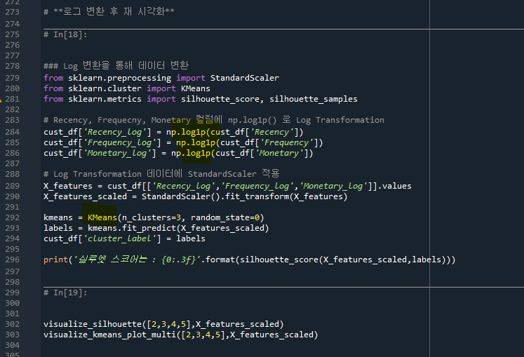 - 296줄: Log변환을 통해 이전에 비해 (160줄과 비교했을 때) 실루어 스코어는 줄어들었음을 볼 수 있다.