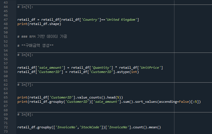 - 84줄: InvoiceDate는 가장 최근의 날짜(max), InvoiceNo는 동일인이 몇번 주문했는지(count), sale_amount는 총구매금액의 합을 의미한다.