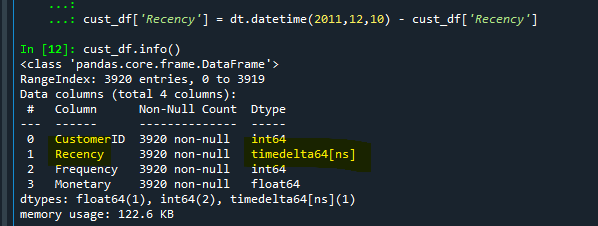 첫 번째 cust_df.info( )를 보면 Recency가 timedelta64로 바뀌었음을 확인할 수 있다.