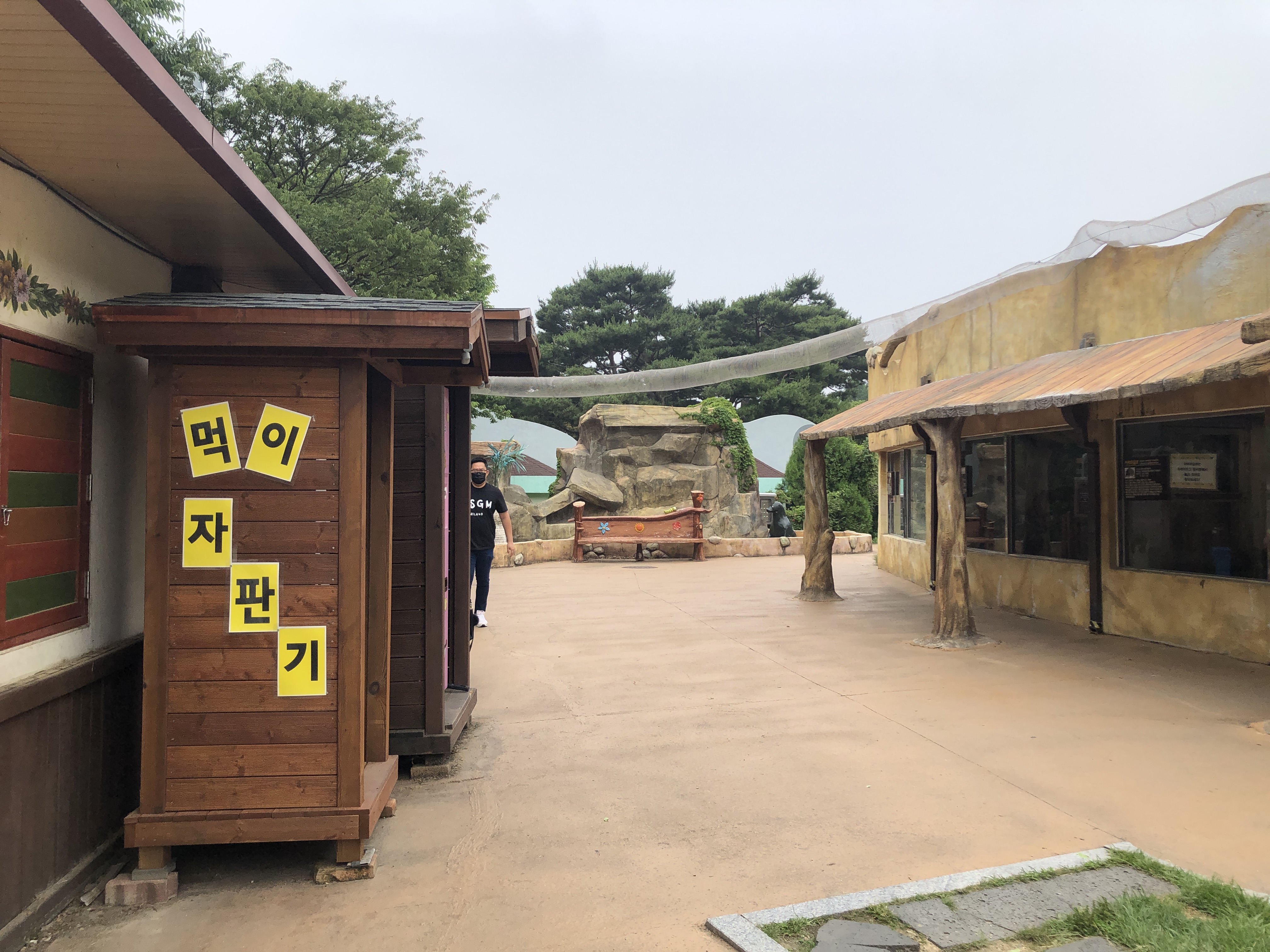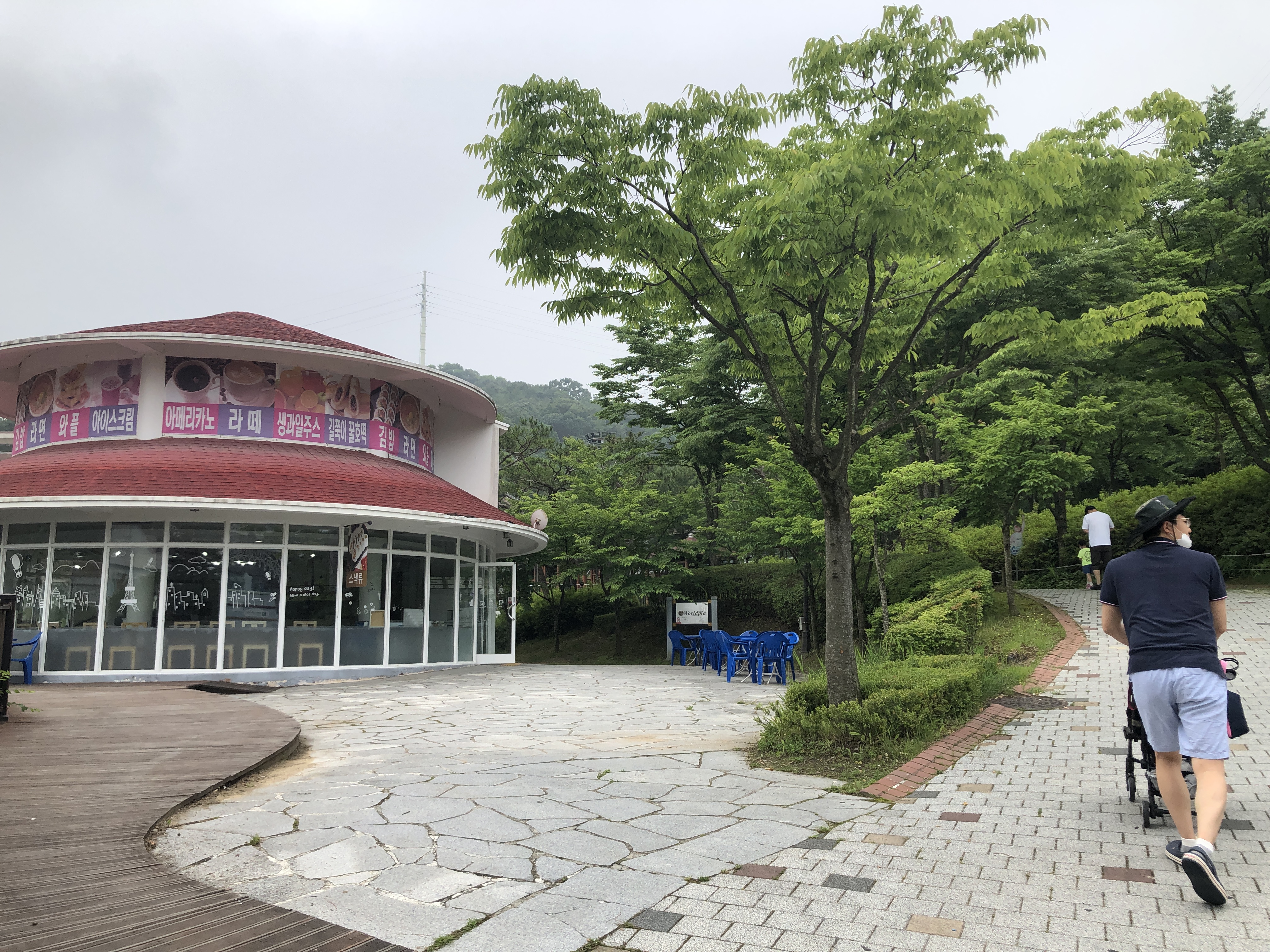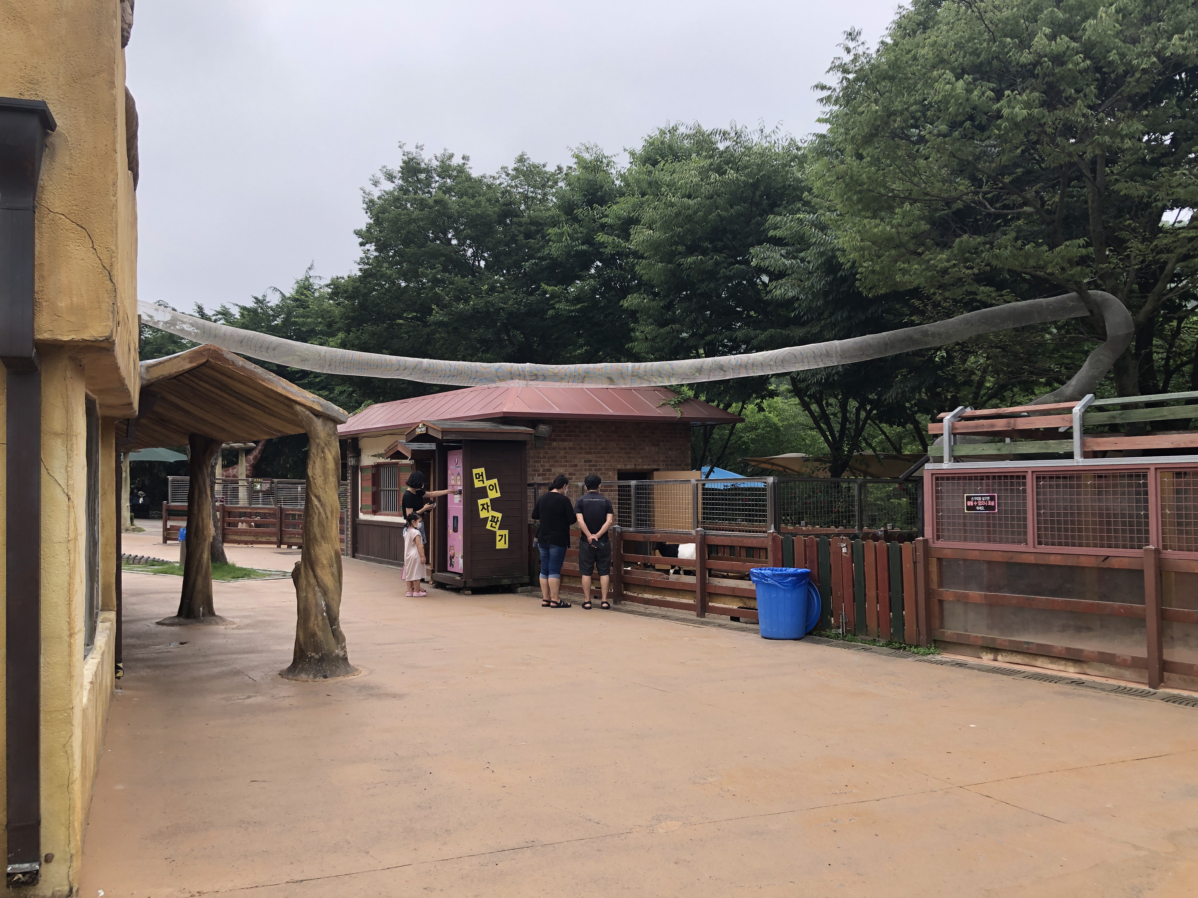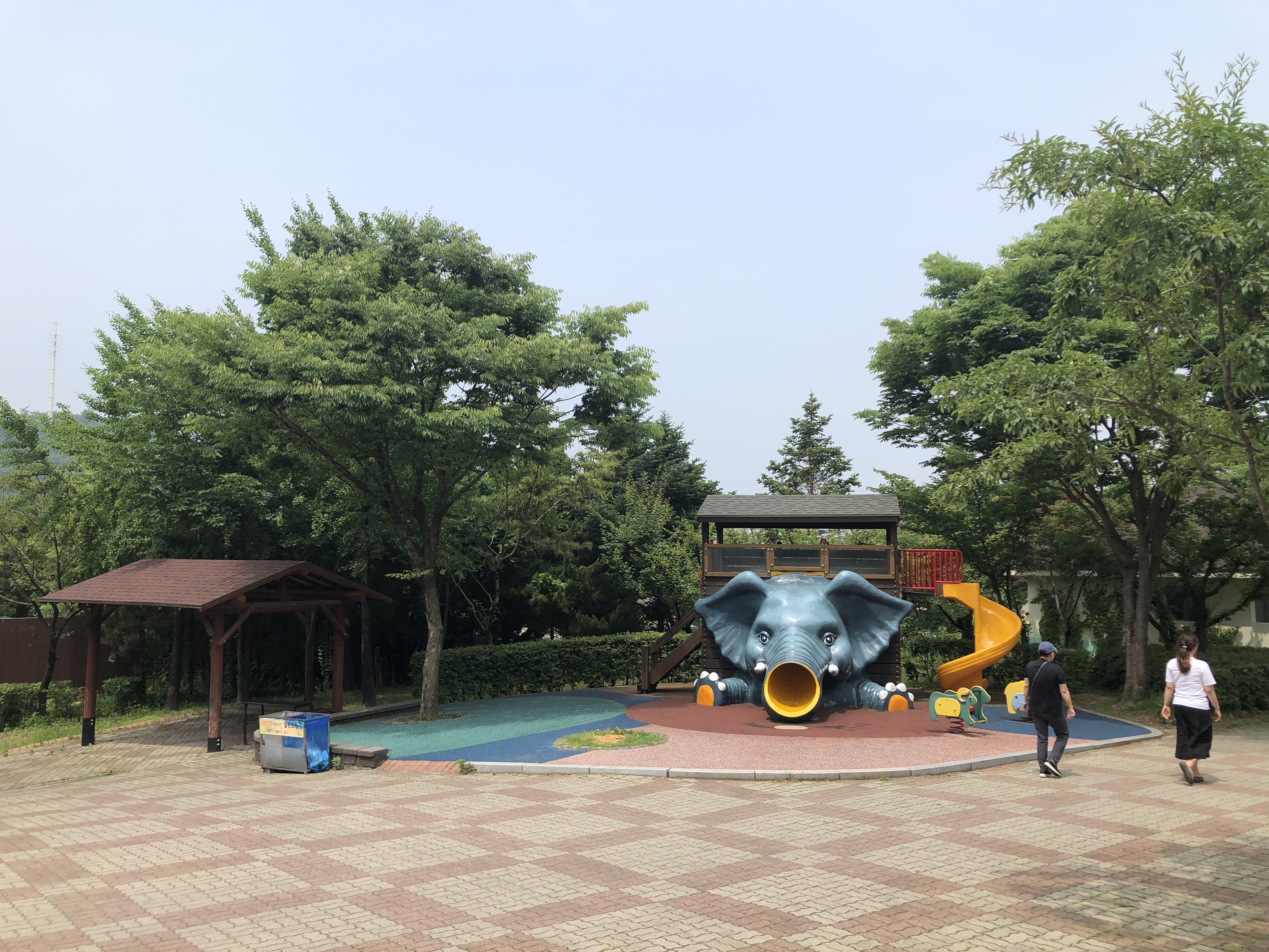 건물 밖에는 바로 코끼리 미끄럼틀이 있고 간식을 먹을 수 있는 피크닉테이블이 있어요. 근처에 화장실이 있어서 볼일을 보고 잠깐 휴식을 취할 수 있습니다. 물이랑 과일로 수분과 당분을 보충하고 다시 마운틴사파리로 올라갔습니다. 생각보다 부지가 넓어서 이렇게 어린이 동물원을 둘러보는 데에만 1시간이 걸렸습니다.