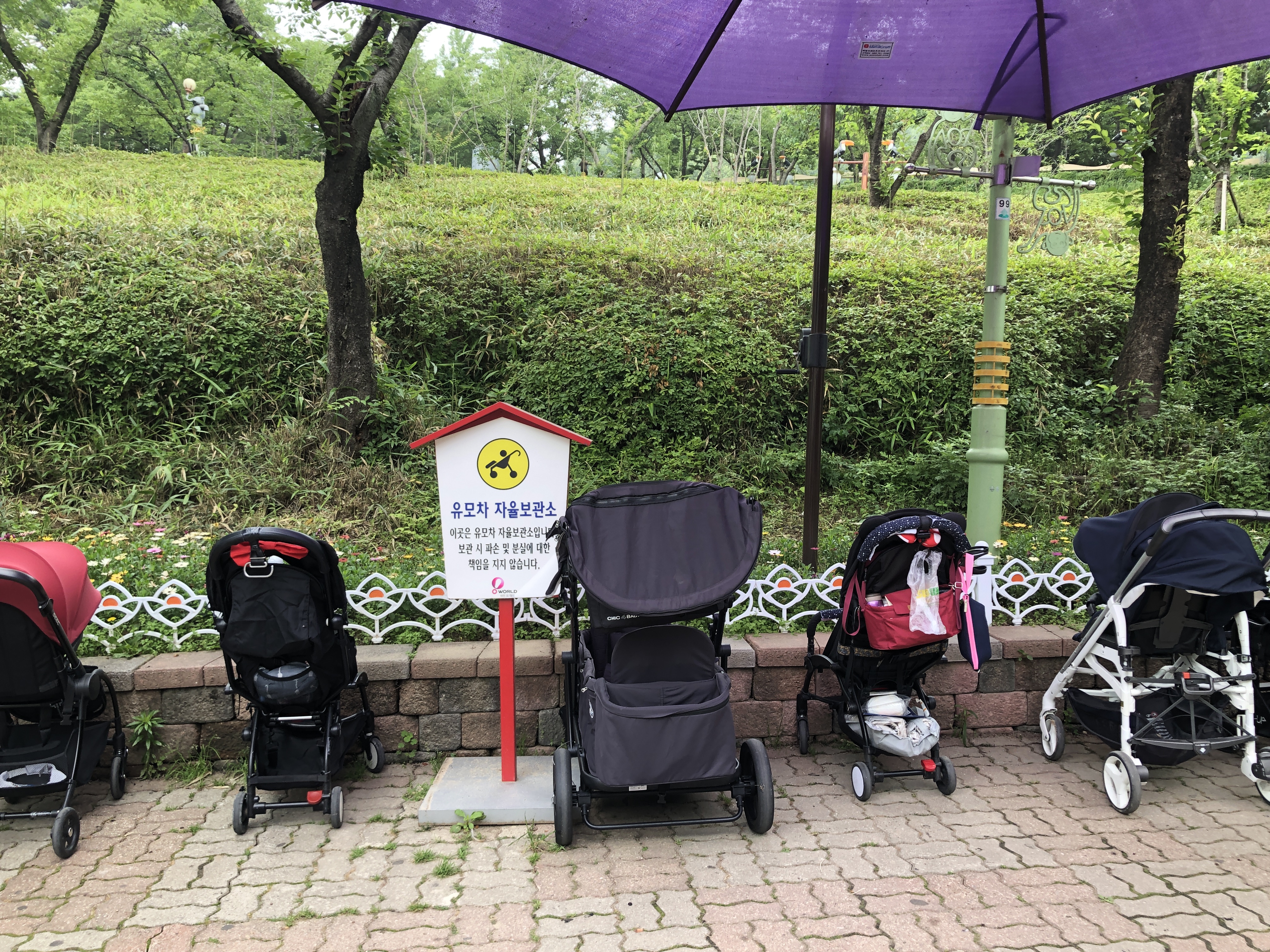 아프리카 사파리 입구 옆에는 유모차 보관소가 있습니다. (차양막이 있어서 약간의 비 정도는 막아줄 것 같습니다.) 사파리 버스는 10분 정도 소요되는데, 혹시 모르니까 중요한 소지품은 들고 탑승하도록 합니다. (음료수, 간식 등은 반입불가입니다.)