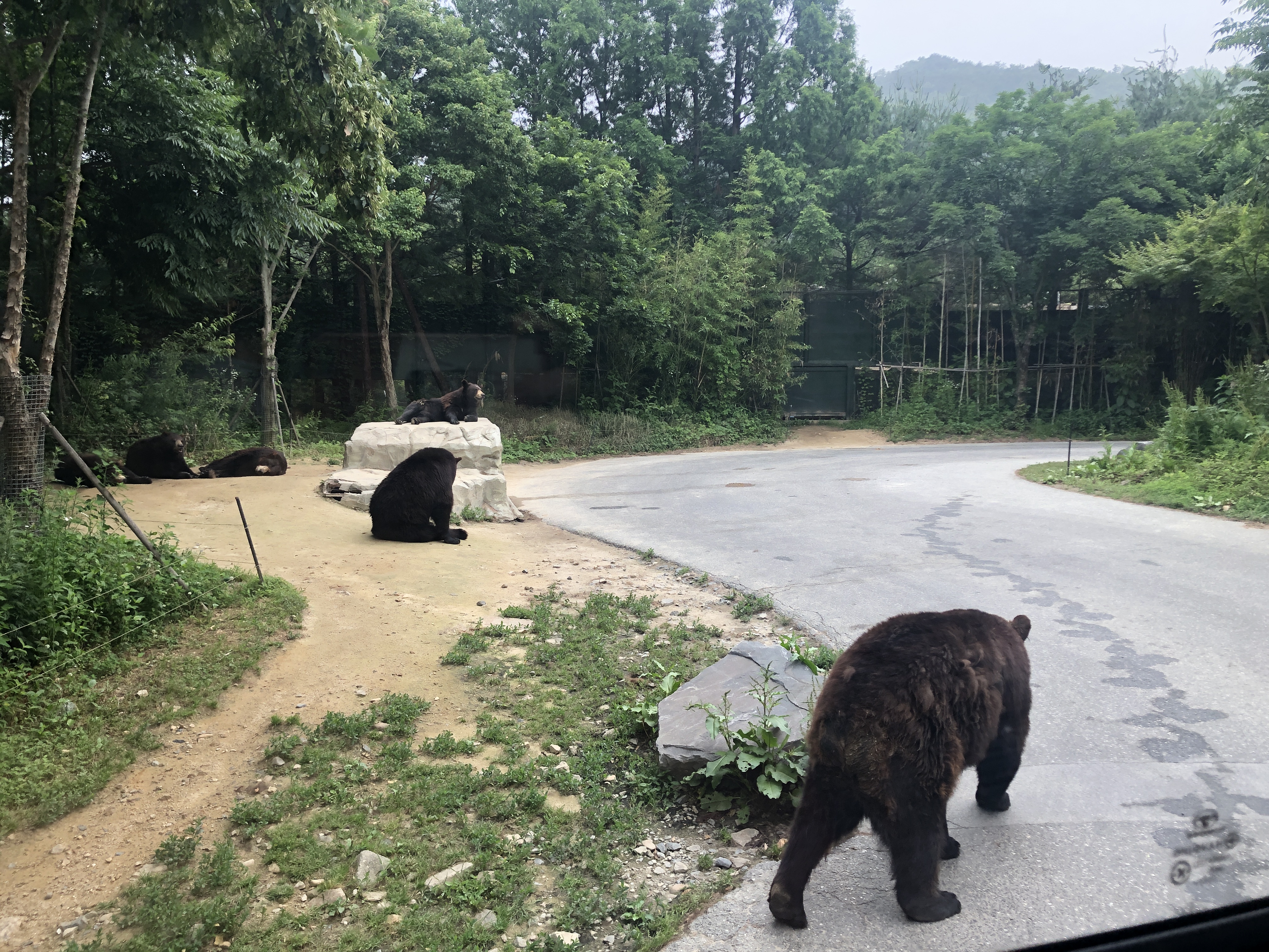 오월드 사파리버스를 타고 처음 만나는 동물은 곰이에요. 날이 더운지 무기력하게 누워있습니다. (육식동물을 비록하여 대부분의 동물들이 무기력하게 누워서 쉬고 있어요. 실내동물원보다 넓은 서식지를 만들었다고 하지만 멀리 이동하지 못하고 같은 공간에 갇혀지내는 동물들은 얼마나 답답할까요? 버스기사 아저씨께서 사과 등 과일을 던저주시지만 먹는게 시원치 않습니다.
