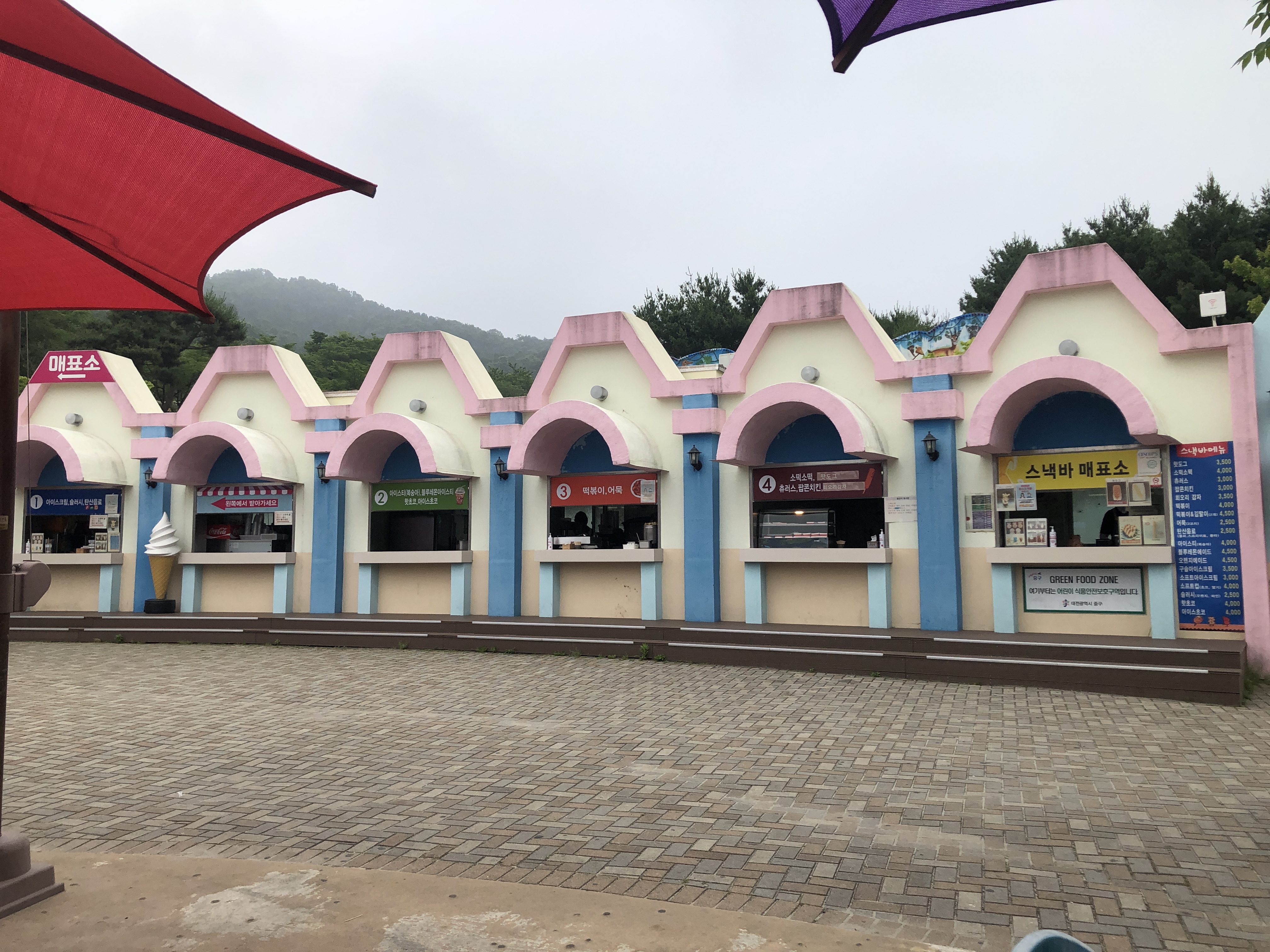 아직 오전이라 사람이 많이 없네요. 아프로디테 조각공원에는 분수가 있고 스낵바와 휴식을 취할 수 있는 벤치가 있습니다. 스낵바에는 떡볶이, 어묵, 핫도그, 소떡소떡, 츄러스, 팝콘치킨, 아이스크림, 슬러시, 탄사음료 등을 팔고 있습니다.