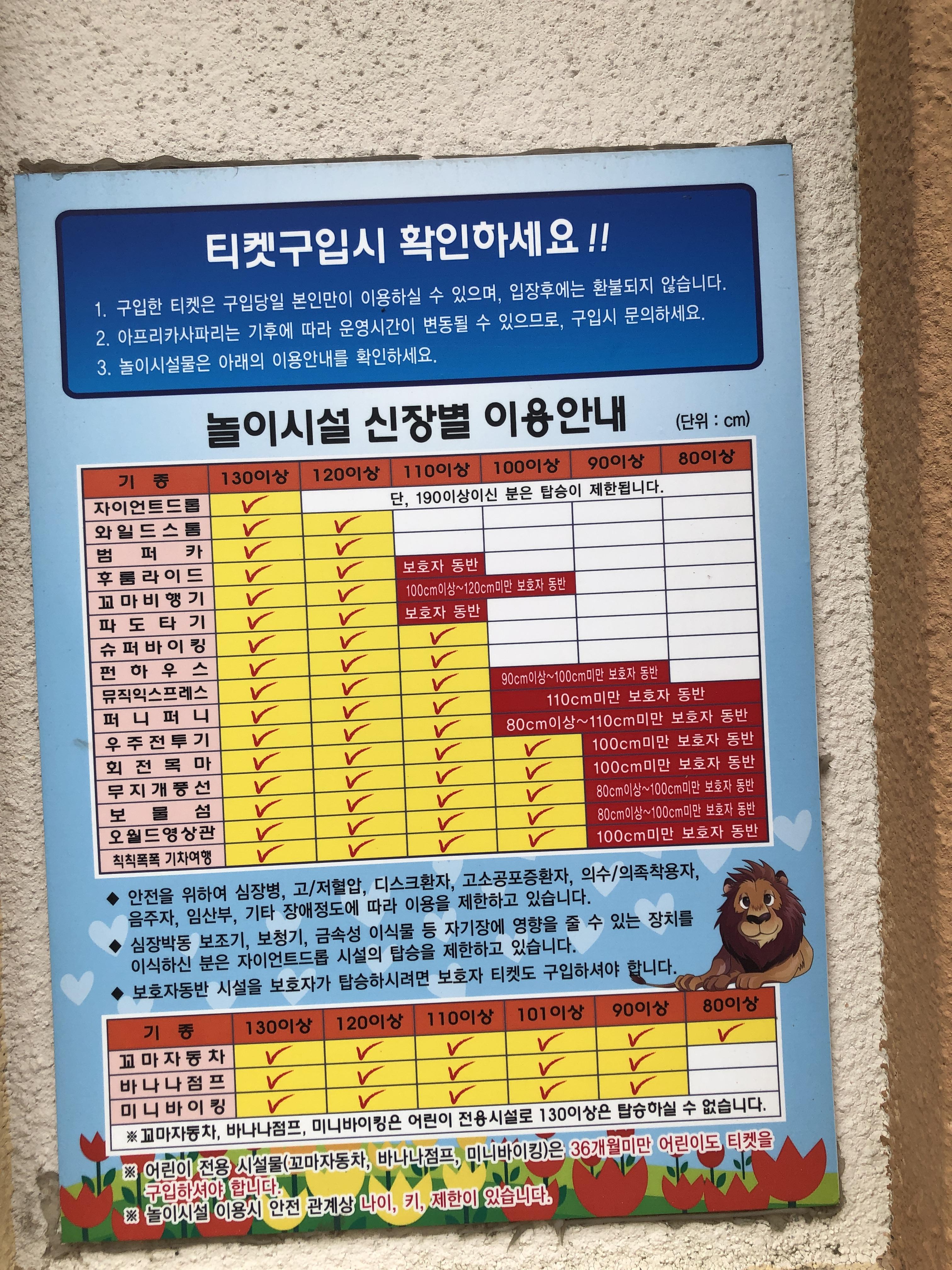 키가 110 이상은 되어야 대부분의 놀이시설을 탑승할 수 있으며 (일부 시설은 보호자 동반필요) 꼬마자동차, 바나나점프, 미니바이킹은 키 80-90이상 2세 아동이 탈 수 있습니다. (2세 아동이 탈 수 있는 놀이시설은 마트에서 흔히보는 동전넣는 작은 기구?라고 생각하면 될 것 같아요. 사파리 버스 대기하는 줄 옆에 있더라구요)