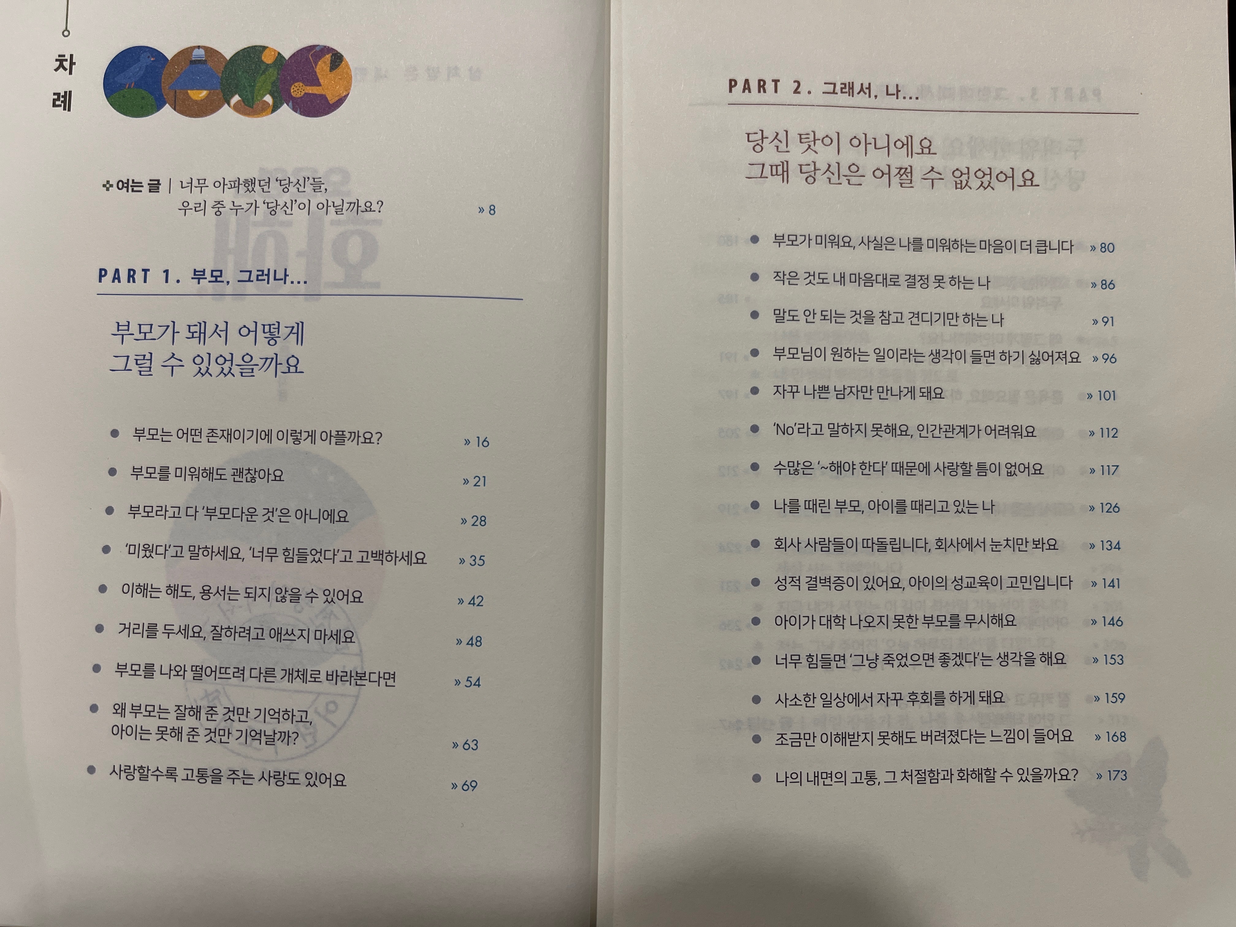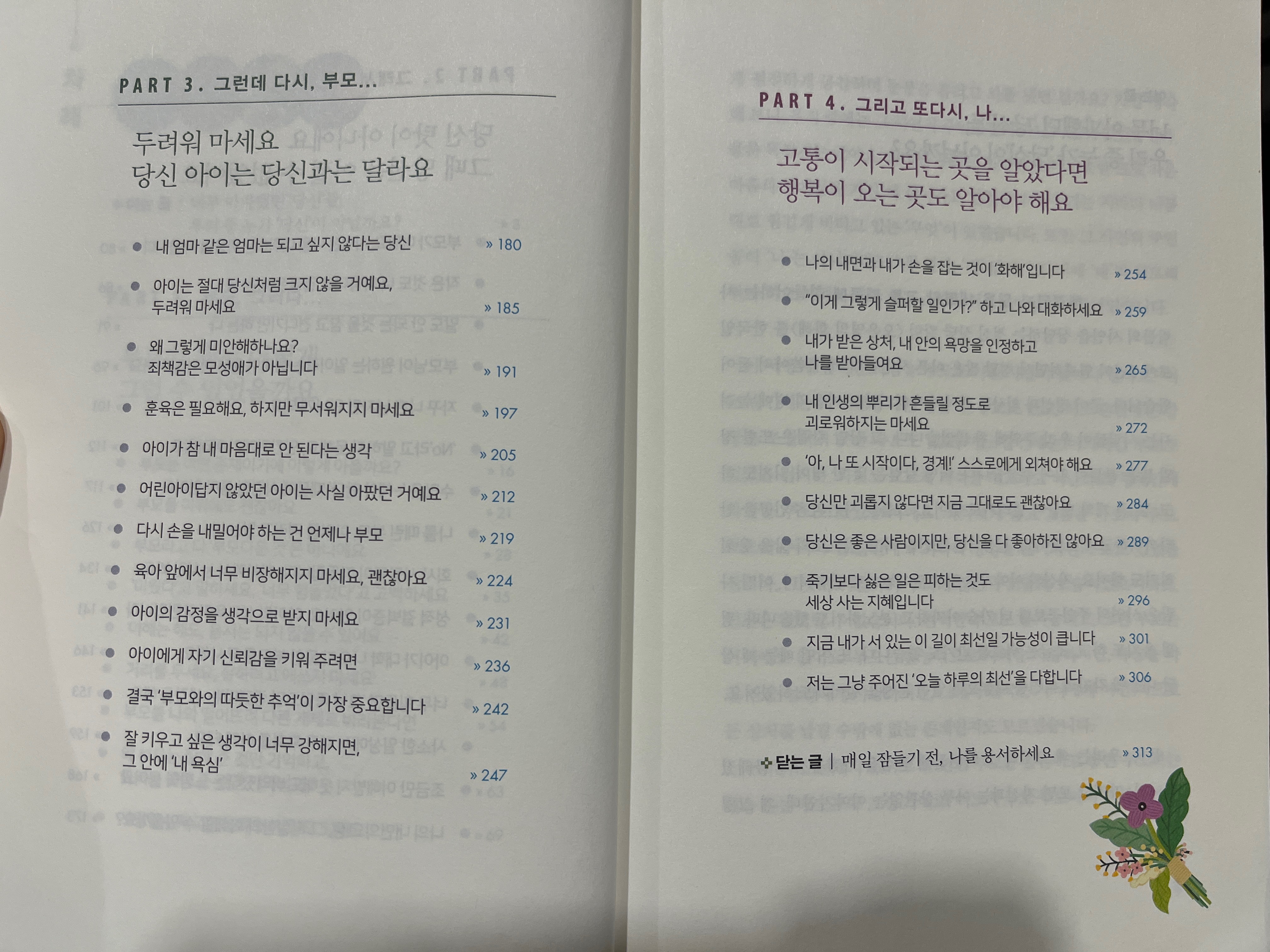 나는 우리 부모님처럼 아이에게 상처를 주지 않으려고 하나, 그렇게 보고 배우고 자라왔기에 어쩔 수 없는 것이다. 나도 돌이켜보면 우리 부모님과 똑같이 아이를 대하는 것 같다. 무엇이 문제일까? 어디서부터 잘못되었을까? 어떻게 하면 바뀔 수 있을까? 오은영 박사님은 “매일 잠들기 전, 나를 용서하세요. 상처의 시작은 ‘나’ 때문이 아니었어요.” 하며 우리의 무거운 어깨를 토닥여주신다.