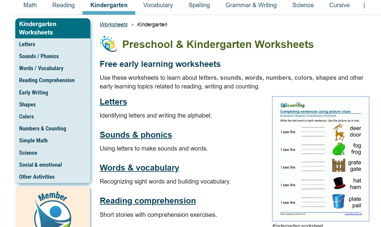 2. K5learning.com (유치원생부터 초등학생까지 사용할 수 있는 다양한 워크지)