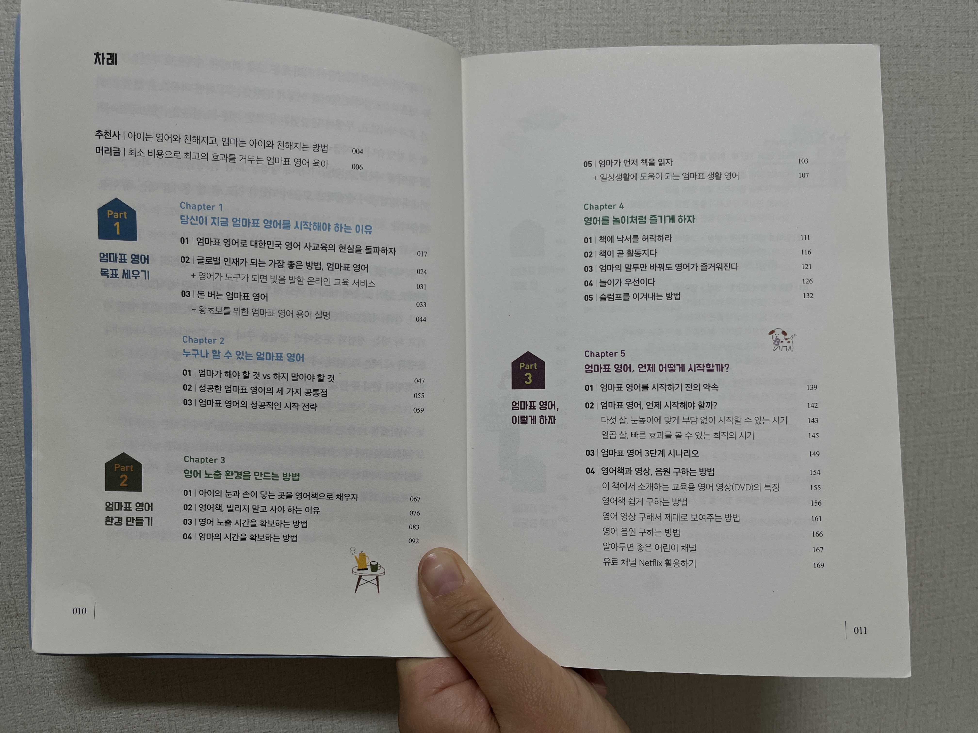 그리고 이 작가의 경험담을 보면 엄마표 영어를 위해 집안일을 최소한으로만 했다는 것, 책은 깔끔히 정리하지 않고 보이는 곳에다 두었다는 것, 책에 낙서도 하는 등 닳도록 읽고 사용했다는 것, 아이와 좋은 관계를 유지하려 했다는 것이다.