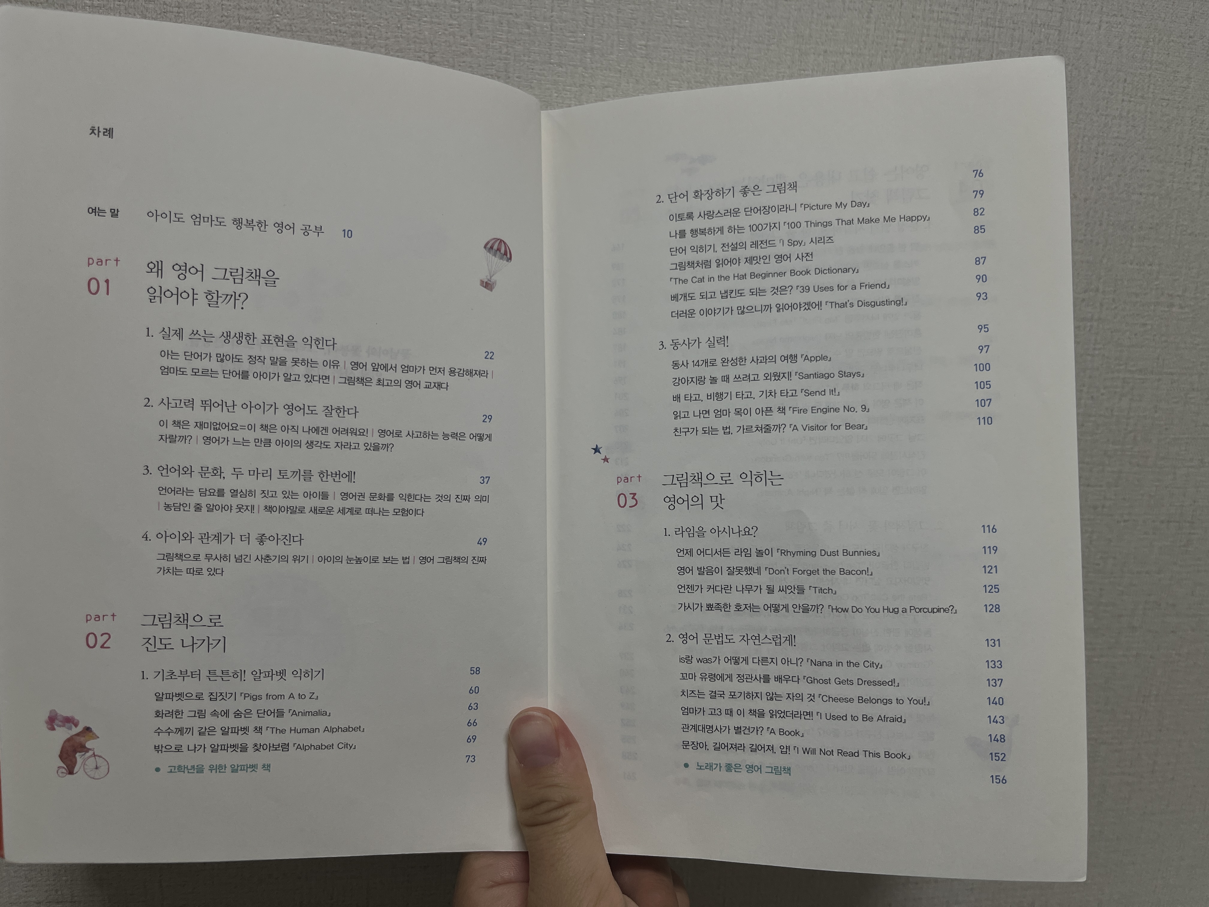 <영어 그림책의 기적>을 읽고 나서 아직 늦지는 않았지만, 내가 하는 노력이 아주 부족하다는 생각이 들었다. 주말부부 프리랜서 워킹맘으로 2년 째 육아하면서 시간이 참 부족하다는 걸 많이 느낀다. 시간은 한정되어 있는데 해야 할 일은 정말 많다. 나도 일을 그만둬야할까? 포기하고 싶은게 하나도 없는데, 어떻게 하면 좋을까.