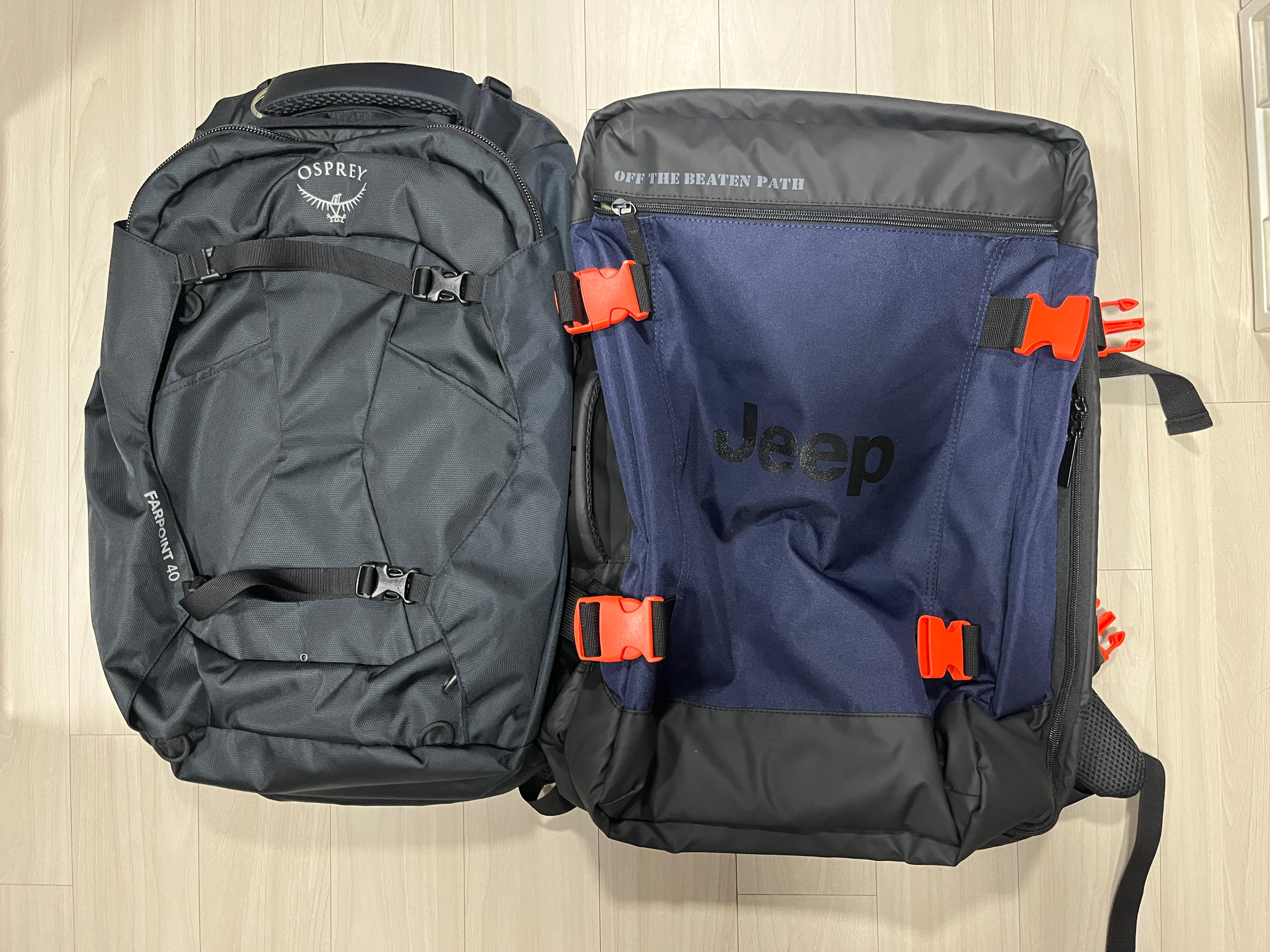 발리 한달 살기 짐싸기를 위해 배낭은 40L로 2개 준비했다. (캐리어는 길이 좋지 않아서 포기!) 오스프리 파포인트와 지프 백팩이다. 오스프리는 등판이 있어서 몸에 딱 밀착되어 성능이 좋지만 이 때문에 가방 내부 부피는 40L 보다 작은 느낌이다. 지프는 캐리어처럼 직사각형에 넓찍하지만 너무 많은 물건을 담으면 가방이 찢어질 것 같이 축 늘어지는 느낌이다. 배낭여행을 하는 사람들이 왜 오스프리~ 오스프리~ 하는지 단박에 알 수 있었다.