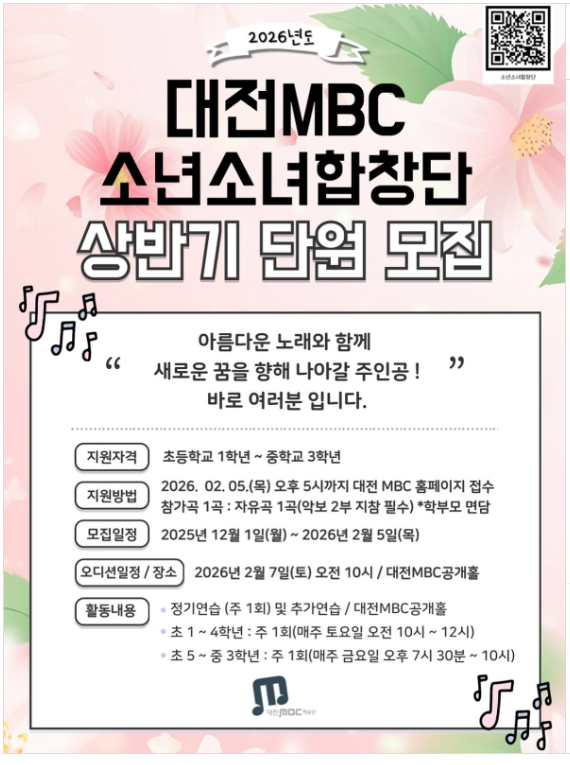 오디션 일시 2025. 2. 7(토) 오전 10시 장소 대전MBC 공개홀 접수일자 2026. 2. 5(목) 17시까지 접수방법 아래 참가신청서 링크에서 신청접수