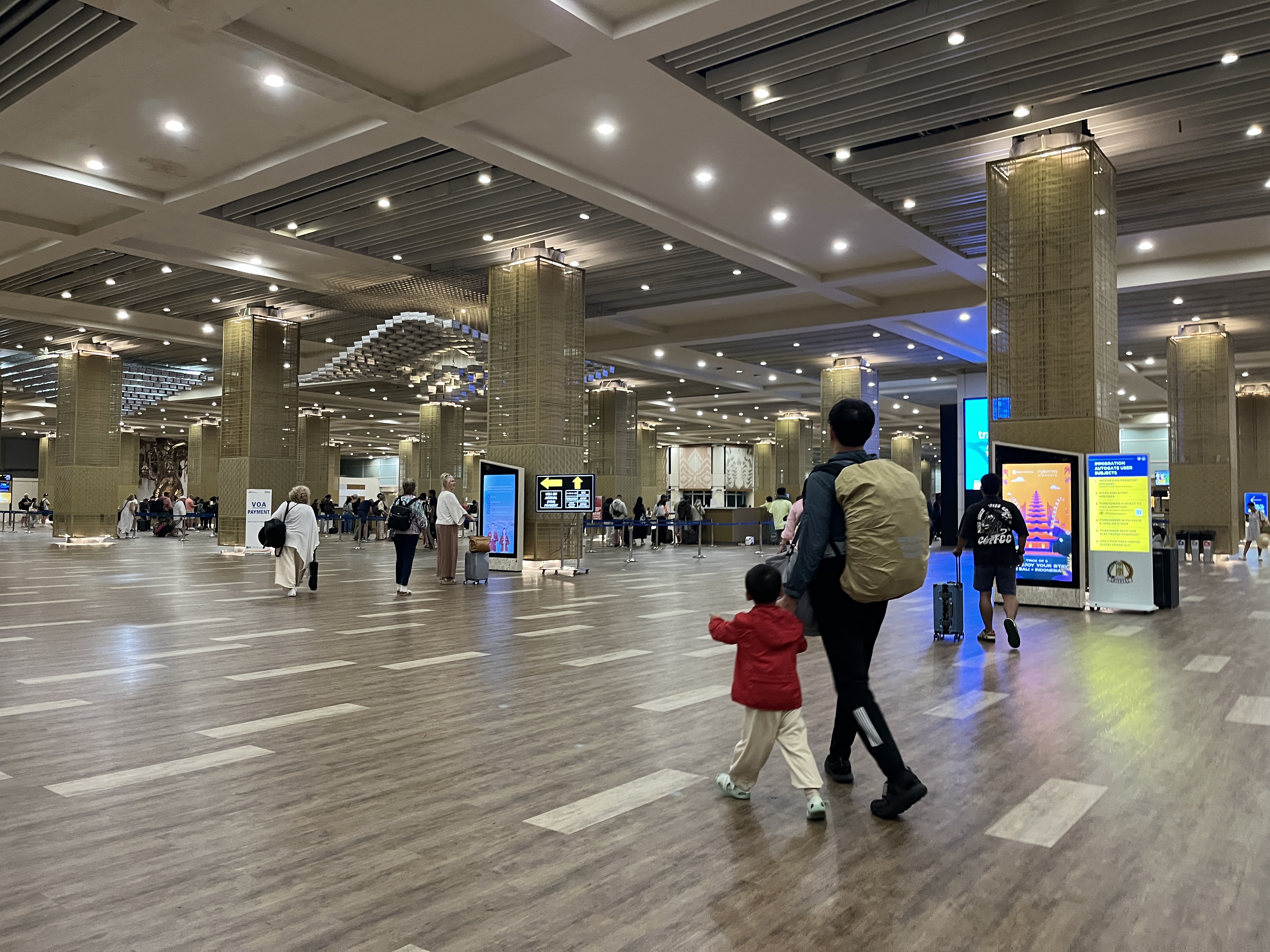 덴파사르에 도착하고나서 공항 밖으로 나가는 데에는 생각보다 오래 걸렸다. 만 6세 이상부터 전자비자를 미리 신청할 수 있었지만 아직 둘째가 만 4세였기에 공항에서 도착비자를 받기로 했다. 도착비자는 전자패드에 정보를 입력하고 비용을 지불하면 A4종이에 비자를 발급해준다.