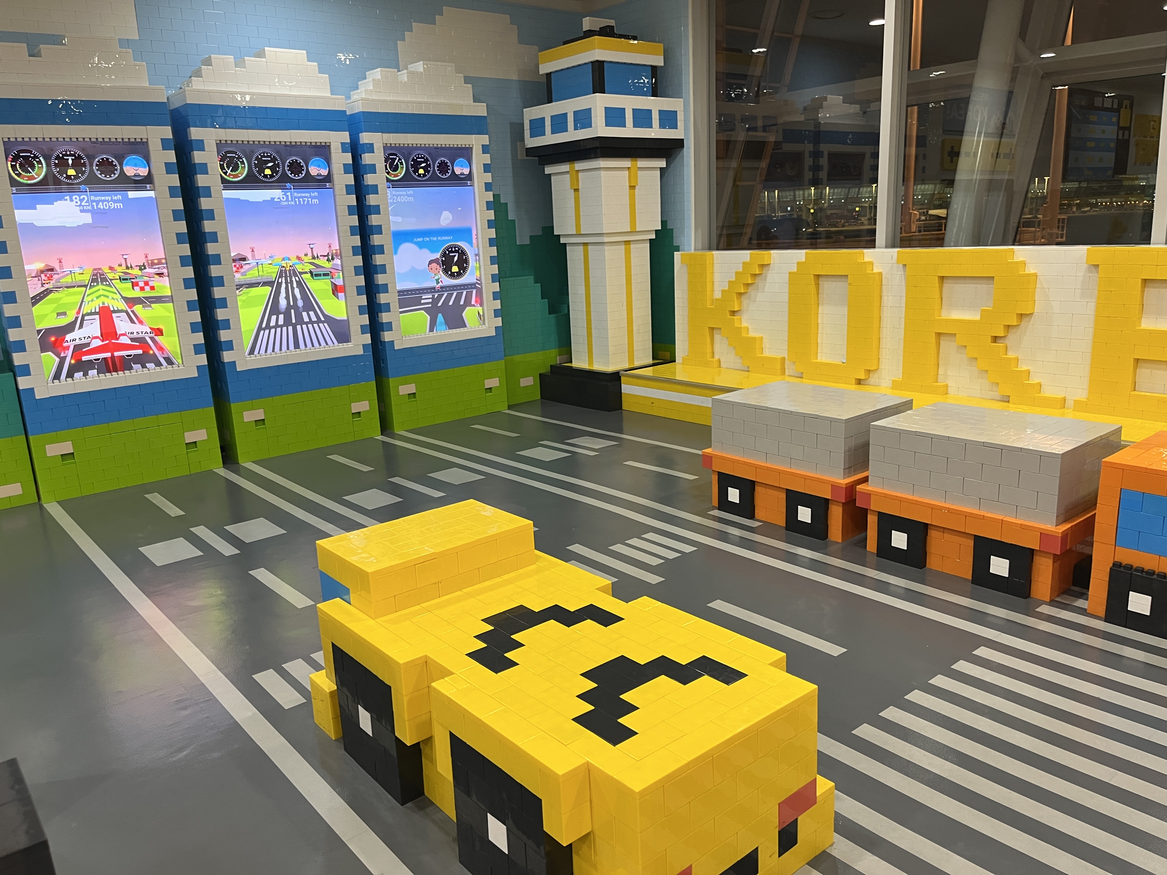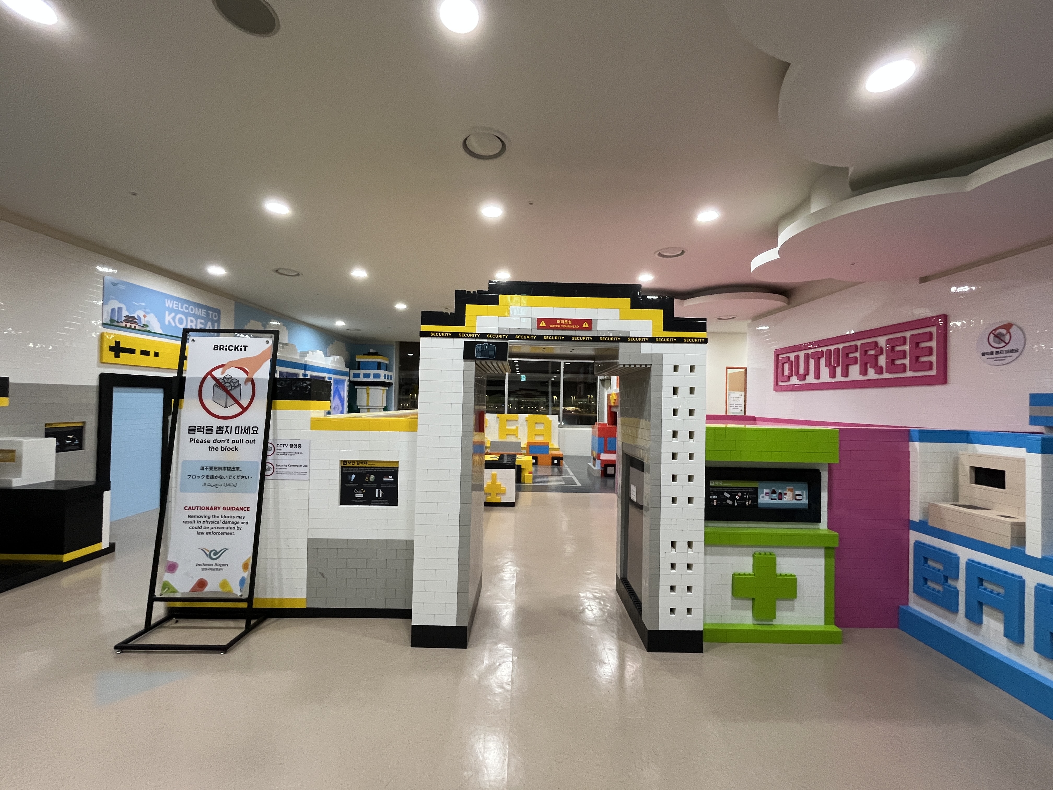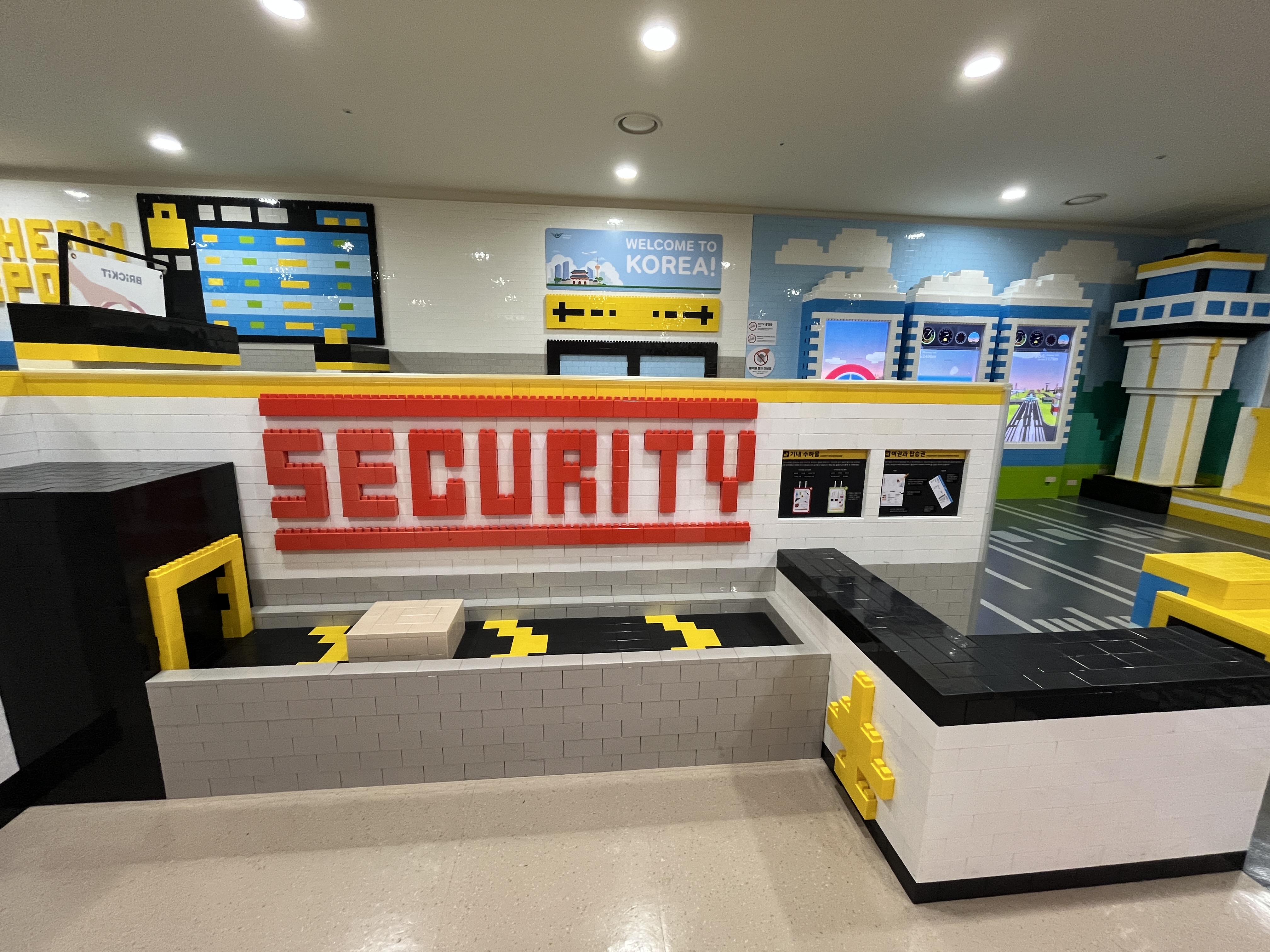 게이트로 가는 길목에는 면세점과 편의점, 음식점 등이 있는데 그 사이에 레고로 만든 키즈존이 있다. 짐검사, 면세점, 활주로 등 공항을 테마로 레고를 만들어서 보기에는 예뻤는데, 모서리가 뾰족해서 어린아이들을 데리고 가기에는 적합하지 않아 보였다. 그냥 아이들이 편하게 누워서 쉴 수 있는 도서관 같은 장소로 만들었더라면 좋았을걸 하는 생각이 든다.