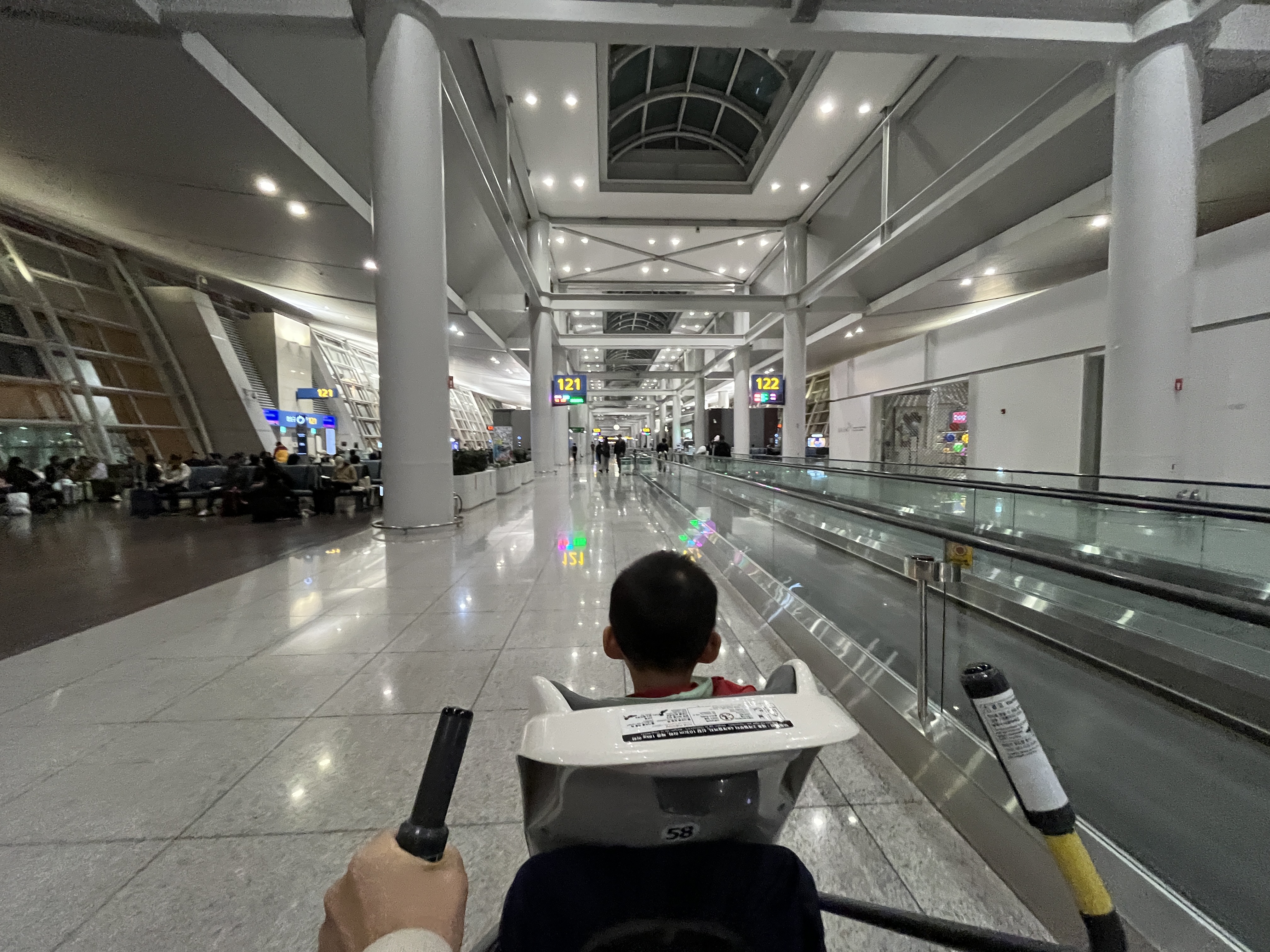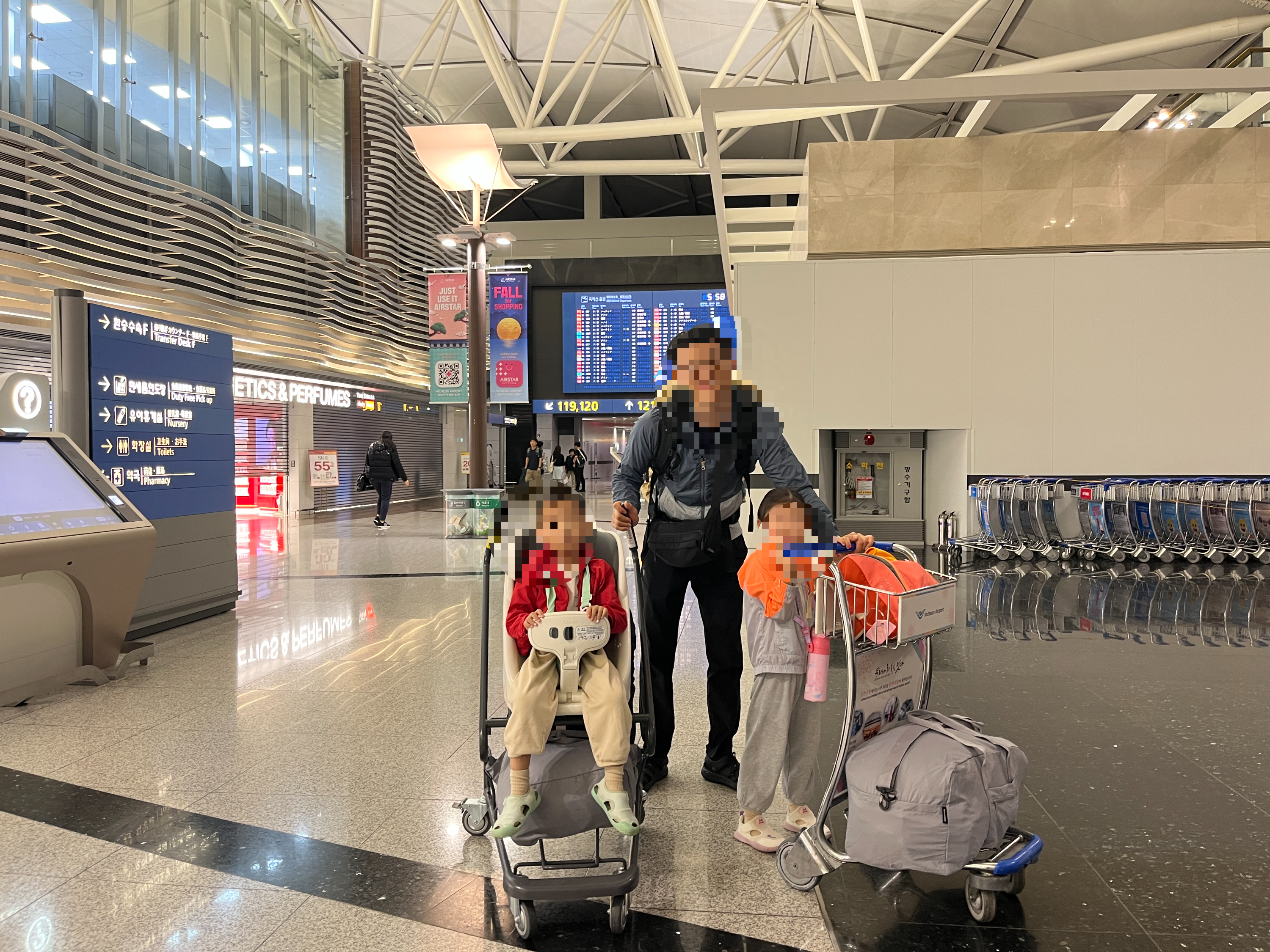 참 다행이었던 것은 셔틀트레인 타고 내리자마자 유아용 카트가 있어서 짐을 싣고 둘째를 태우고 출국장까지 갈 수 있었다는 것이었다. 안 그랬으면 짐 들고 아이까지 안고 너무 힘들 뻔했다.