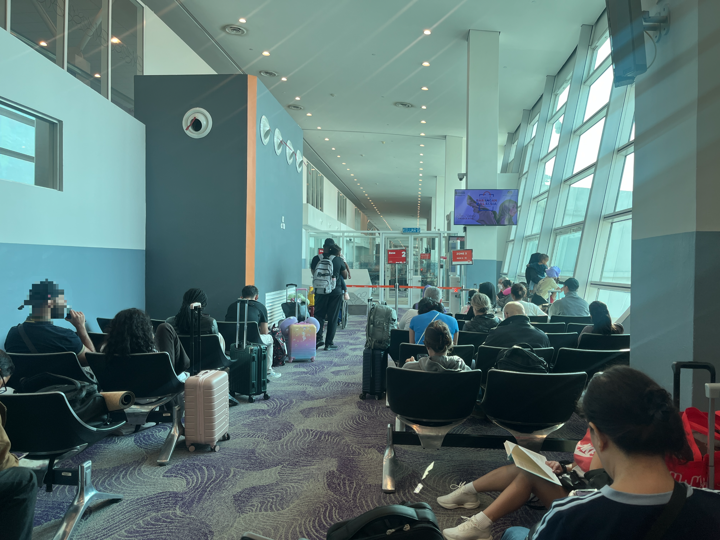 쿠알라룸프르 제2터미널 게이트는 좁긴한데 있을 것은 다 있다. 사람이 많아서 앉을 자리가 별로 없다는 것이 단점. 화장실에 갔다와서 정수기에 물을 담고 게이트가 열리자마자 비행기표를 찍고 안으로 들어갔다. 드디어 비행기를 타러가는줄 알았더니 20~30분간 여기서 대기를 했다. (화장실을 가려면 다시 나가야 하니까 그냥 미리 다녀오는 걸 추천!)