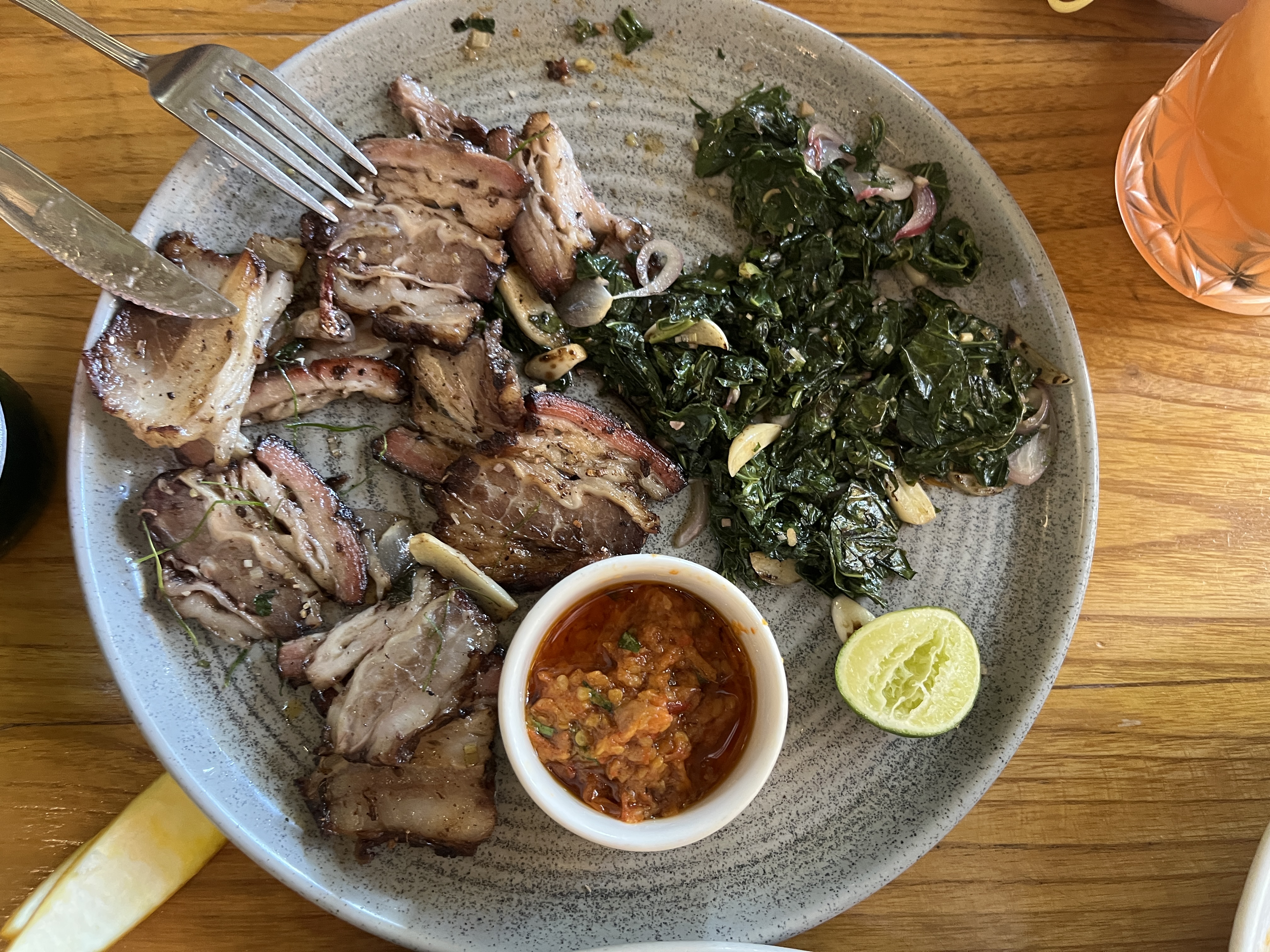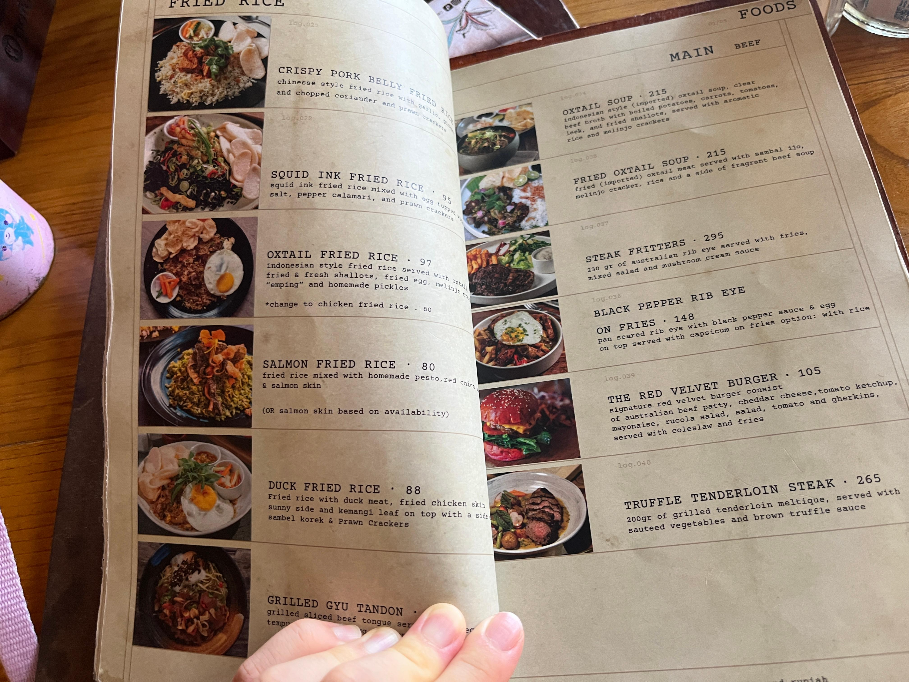 Cold pressed Juice Mix (50K), Cold pressed Juice Orange (50K), Bintang (45K), Pork Belly fried rice (95K), Truffle steak (265K), Bolognese spaghetti (79K), Sei Spai Sambal laut (160K) (스파게티 사진은 찍지 못했지만 맛있었음)