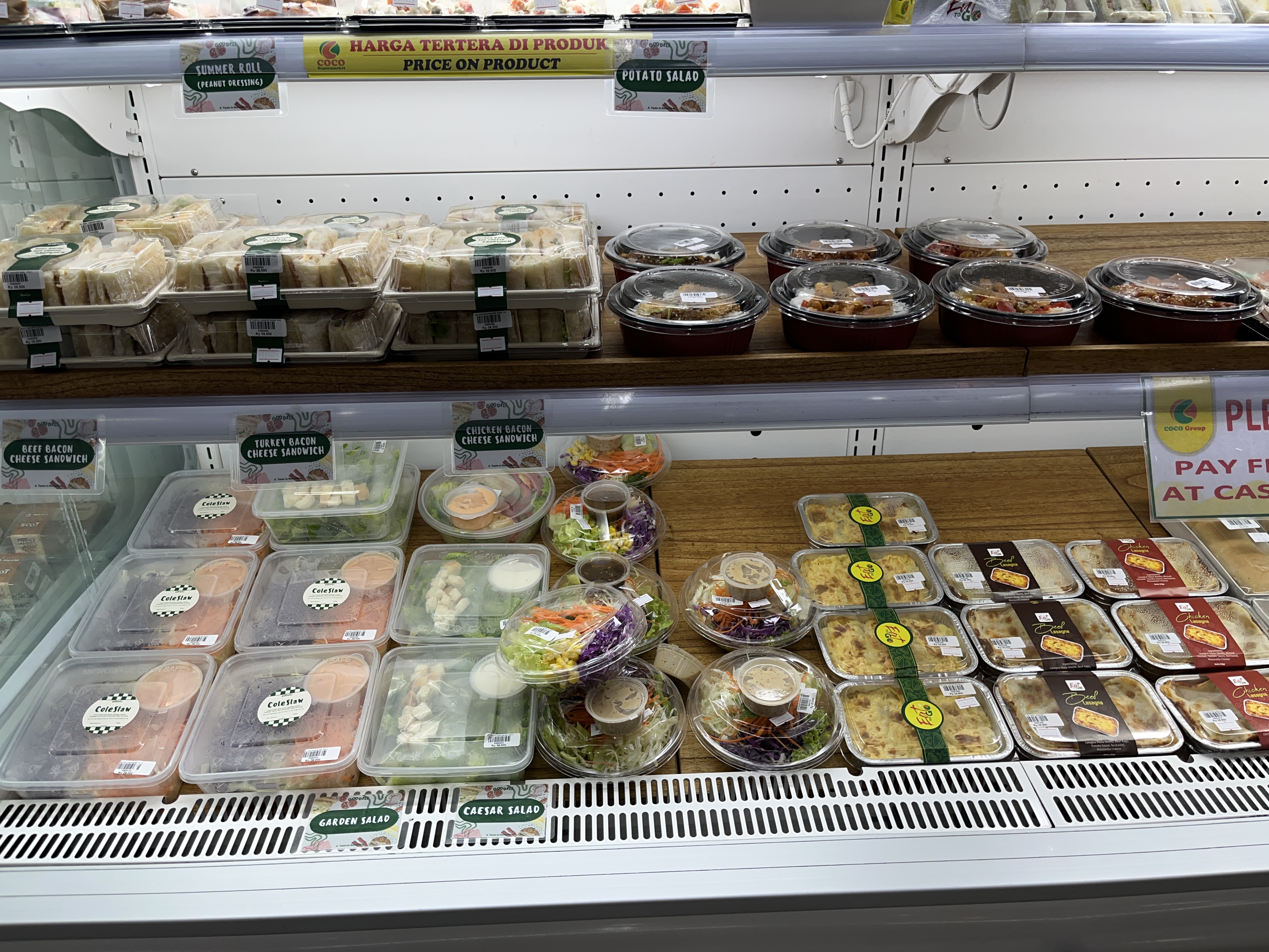 1층에는 야채/과일, 계란, 두부, 유제품, 빵, 햄, 소시지, 가공식품(햇반 없음), 김밥/도시락, 냉동생선, 과자, 같은 음식과 (정육은 없다) 샴푸, 비누, 클렌징오일, 바디스크럽, 헤어오일, 프라이팬, 지퍼백 같은 생활용품도 팔고 있었다. 또한 사롱, 인센스스틱 같은 기념품도 팔고 있어서 급하면 여기서 사도 괜찮을 듯하다. 그래서인지 호주사람들이 단체로 관광버스에서 내려서 쇼핑하는 곳으로 보인다.